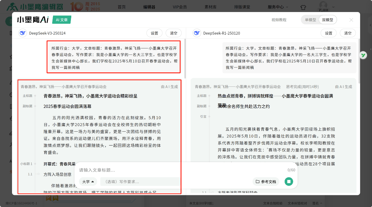 1分钟生成15个标题,瞬间感觉自己起的标题——《青春激昂,神采飞扬|小墨鹰大学召开春季运动会》LOW爆了!!!