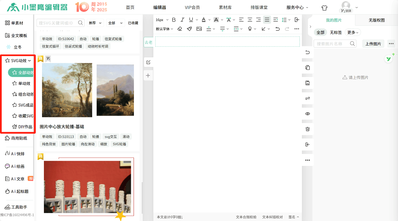 单击左侧的“SVG动效”,在素材选择区选择一个喜欢的素材,插入文章当中,这样,一个动画就添加好了。
