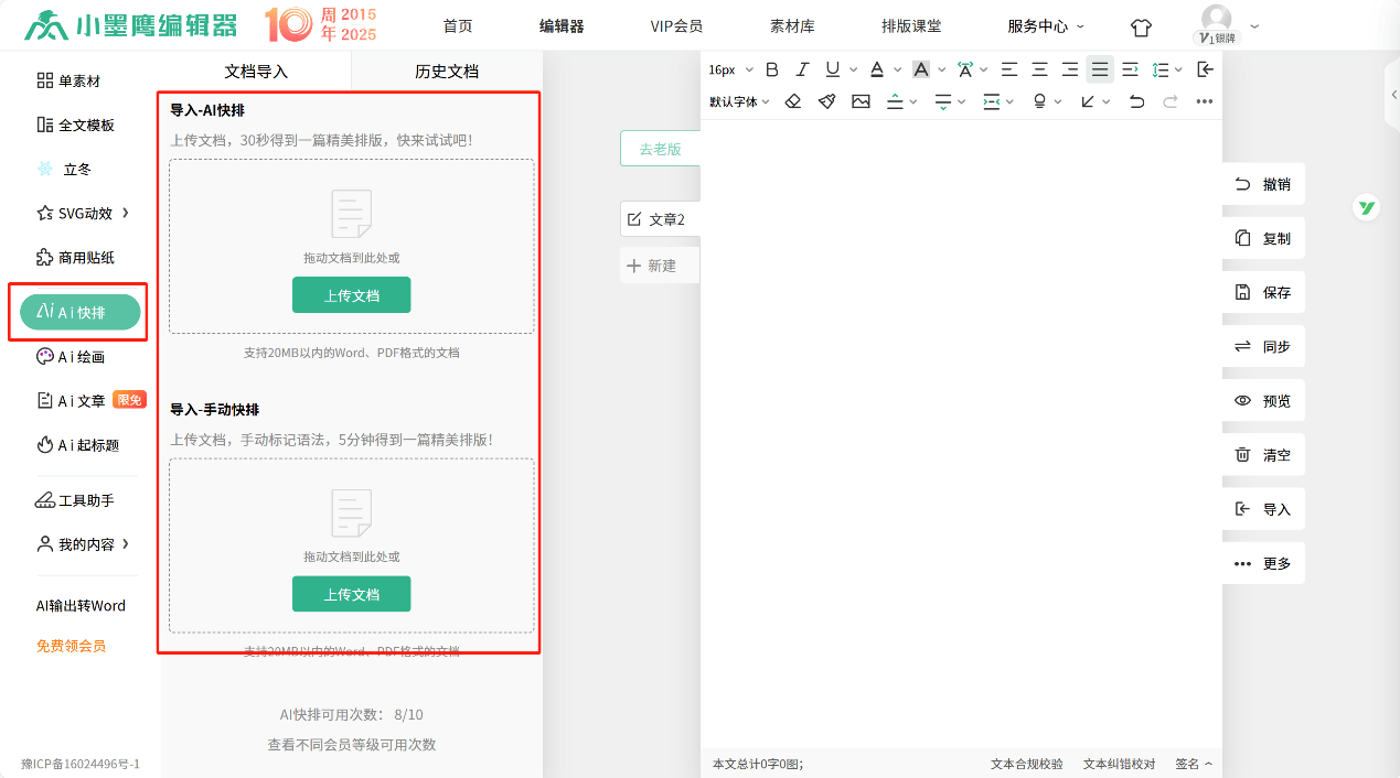 如果赶时间,来不及手动排版,可以将文章一键导入编辑器,实现AI快排~在左侧功能选择区点击“AI快排”-“上传文档”即可进行文章快速排版啦!