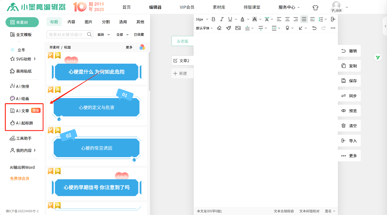 在右侧的文章编辑区,你可以调整文本的格式,比如字体、字号、首行缩进、对齐格式、如何插入图片等等。右侧的小工具栏中,你可以复制文章,或者保存文章、预览文章,每个用户都可以实现同时编辑多篇文章~