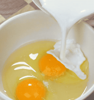 这个手法特别关键,加糖是为了让鸡蛋和牛奶融合,吃起来一点腥味都没有,出来还带点焦香,特别香。