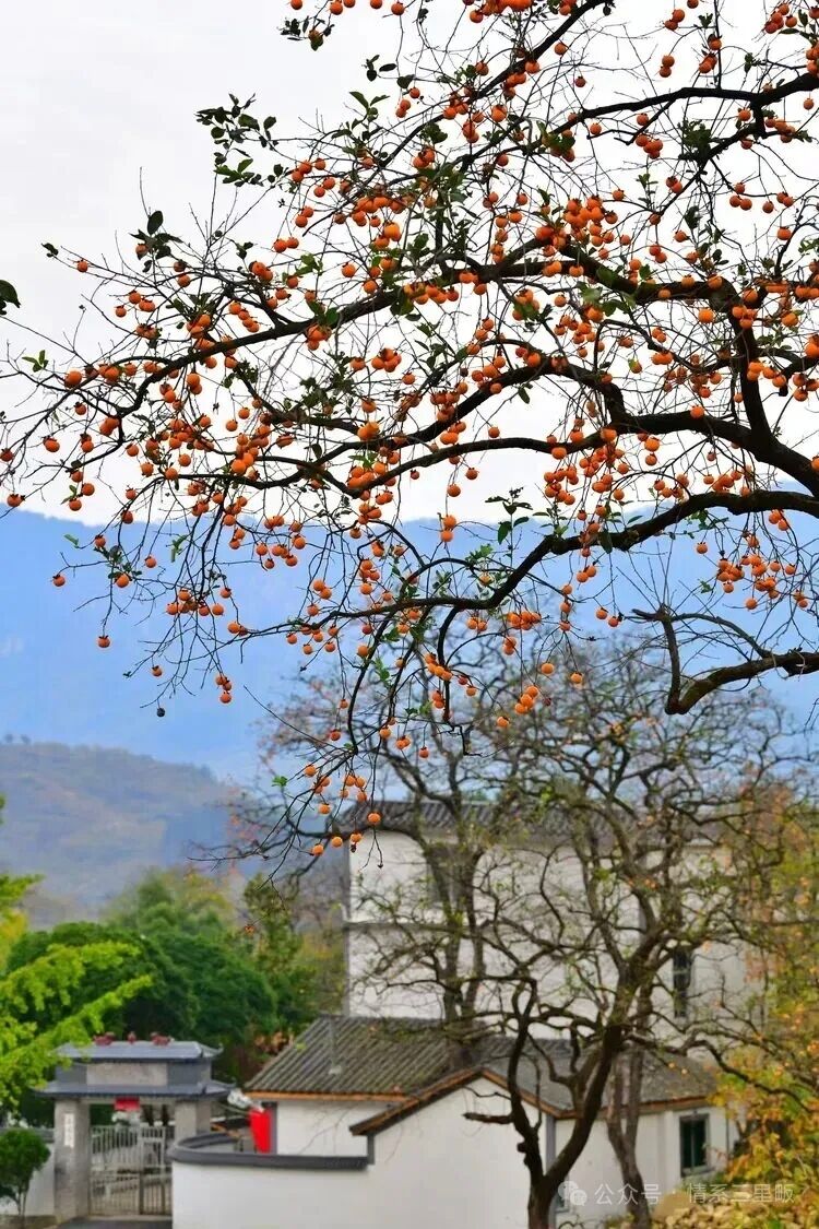 6000余株百年以上的古柿树在此扎根,其中700余株平均树龄达200年的连片古树,像训练有素的士兵,又似闲适的老友,错落有致地分布在山坡、溪畔与田埂间。秋阳穿过枝叶的缝隙洒下,在金黄的柿果上镀了一层琥珀光,风过时,熟透的柿子轻轻摇晃,偶有几颗坠入铺满落叶的泥土,发出"噗"的轻响,惊起几只觅食的山雀。