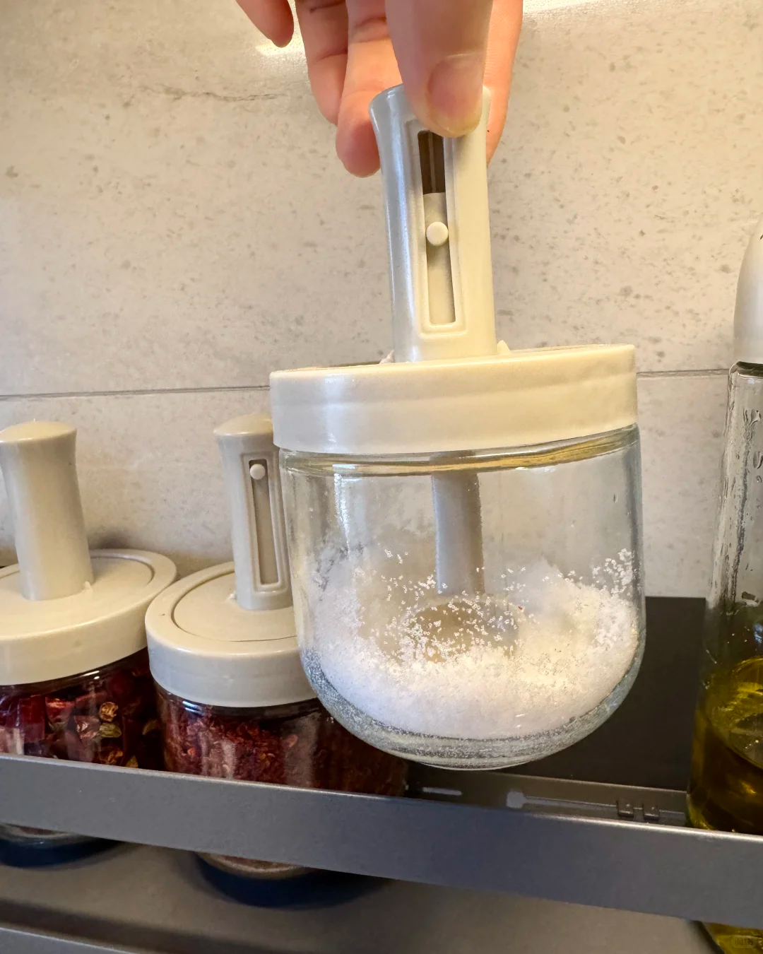 网友@绿茶粉 的分享:我爸买了这个一体盐罐,好几次都将盐罐里的盐弄潮,我直接换了别的盐罐,这个一点都不好用。