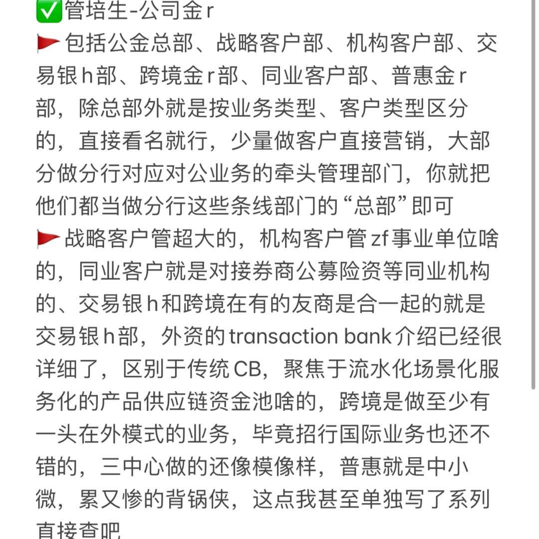 🚩战略客户管超大的,机构客户管zf事业单位啥的,同业客户就是对接券商公募险资等同业机构的、交易银h和跨境在有的友商是合一起的就是交易银h部,外资的transaction bank介绍已经很详细了,区别于传统CB,聚焦于流水化场景化服务化的产品供应链资金池啥的,跨境是做至少有一头在外模式的业务,毕竟招行国际业务也还不错的,三中心做的还像模像样,普惠就是中小微,累又惨的背锅侠,这点我甚至单独写了系列直接查吧