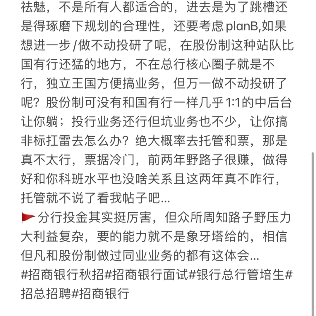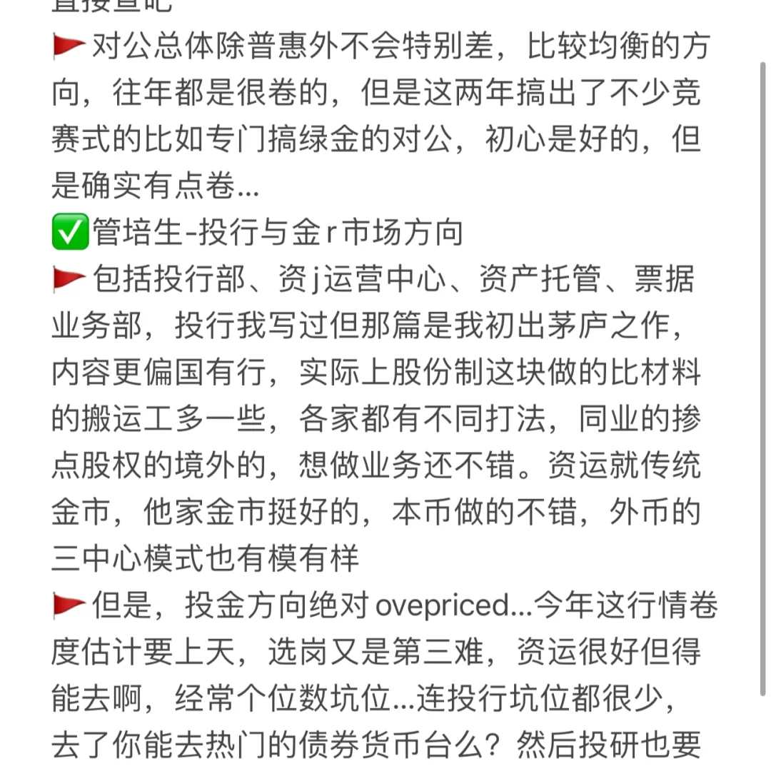 🚩但是,投金方向绝对ovepriced…今年这行情卷度估计要上天,选岗又是第三难,资运很好但得能去啊,经常个位数坑位…连投行坑位都很少,去了你能去热门的债券货币台么?然后投研也要祛魅,不是所有人都适合的,进去是为了跳槽还是得琢磨下规划的合理性,还要考虑planB,如果想进一步/做不动投研了呢,在股份制这种站队比国有行还猛的地方,不在总行核心圈子就是不行,独立王国方便搞业务,但万一做不动投研了呢?股份制可没有和国有行一样几乎1:1的中后台让你躺;投行业务还行但坑业务也不少,让你搞非标扛雷去怎么办?绝大概率去托管和票,那是真不太行,票据冷门,前两年野路子很赚,做得好和你科班水平也没啥关系且这两年真不咋行,托管就不说了看我帖子吧…