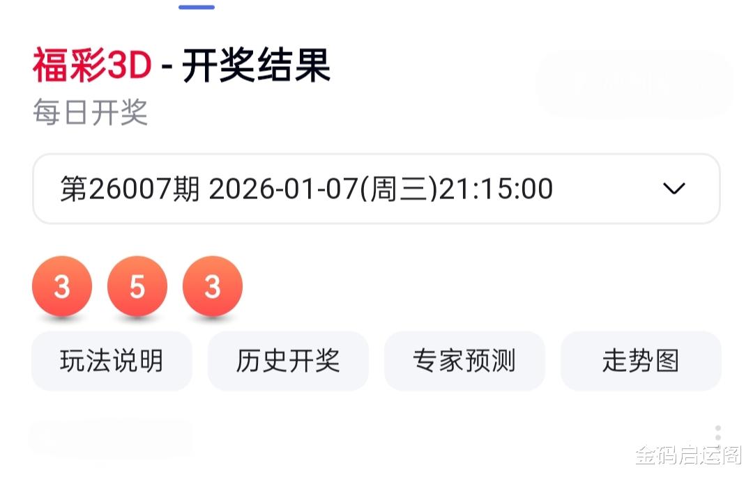 福彩3D第26007期开奖,号码锁定为 3、5、3。