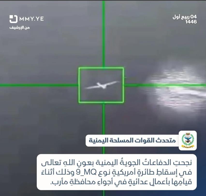 就在今晨,也门武装部队就此事公开发表声明确认了此事,声明中强调,也门武装部队此举是为了支持受压迫的巴勒斯坦人民及圣战战士,同时也是为了反击美英两国对也门的侵略!所以,在今夜于也门马里卜省上空击落了当时正在进行敌对侦察活动的美军MQ-9型无人机!