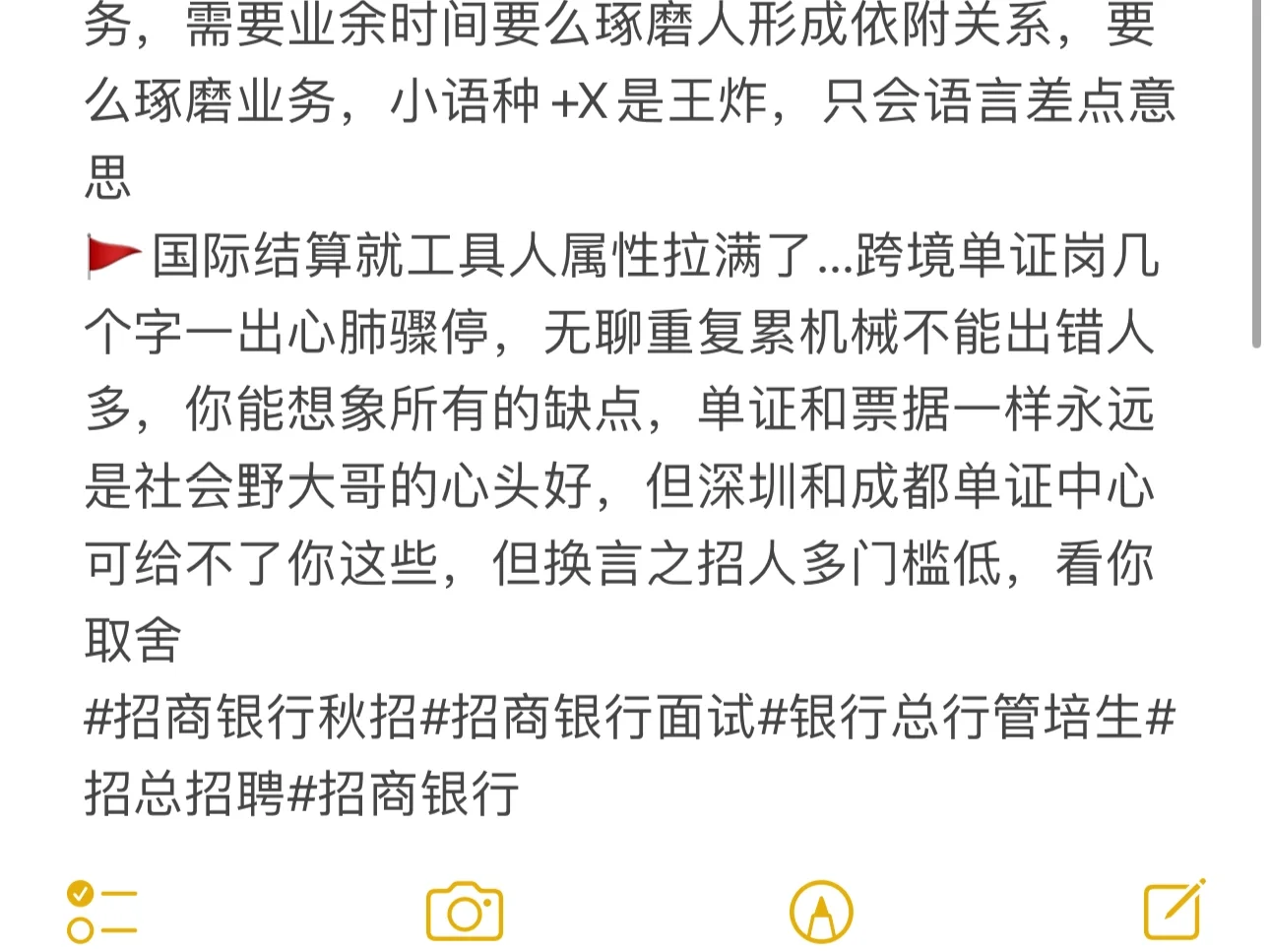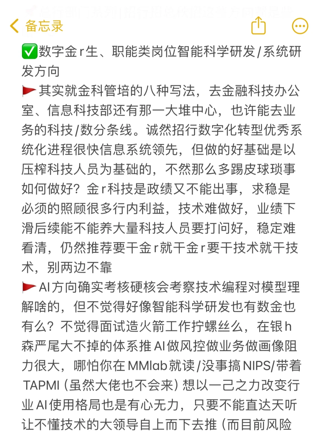 🚩其实就金科管培的八种写法,去金融科技办公室、信息科技部还有那一大堆中心,也许能去业务的科技/数分条线。诚然招行数字化转型优秀系统化进程很快信息系统领先,但做的好基础是以压榨科技人员为基础的,不然那么多踢皮球琐事如何做好?金r科技是政绩又不能出事,求稳是必须的照顾很多行内利益,技术难做好,业绩下滑后续能不能养大量科技人员要打问好,稳定难看清,仍然推荐要干金r就干金r要干技术就干技术,别两边不靠