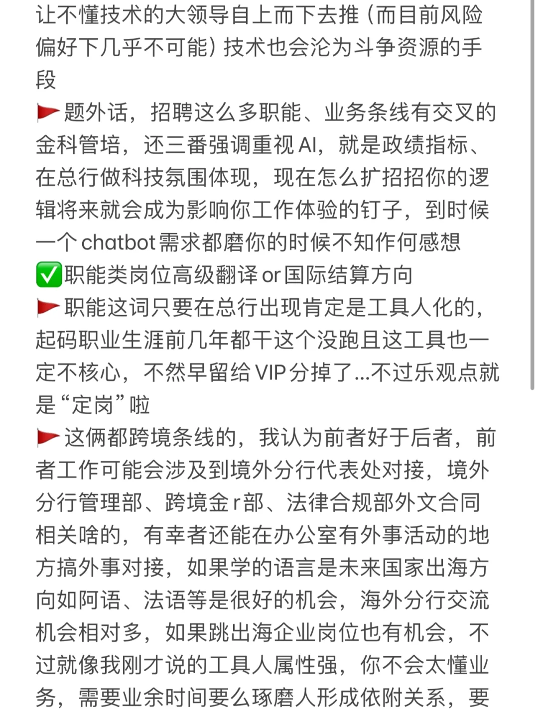 🚩这俩都跨境条线的,我认为前者好于后者,前者工作可能会涉及到境外分行代表处对接,境外分行管理部、跨境金r部、法律合规部外文合同相关啥的,有幸者还能在办公室有外事活动的地方搞外事对接,如果学的语言是未来国家出海方向如阿语、法语等是很好的机会,海外分行交流机会相对多,如果跳出海企业岗位也有机会,不过就像我刚才说的工具人属性强,你不会太懂业务,需要业余时间要么琢磨人形成依附关系,要么琢磨业务,小语种+X是王炸,只会语言差点意思