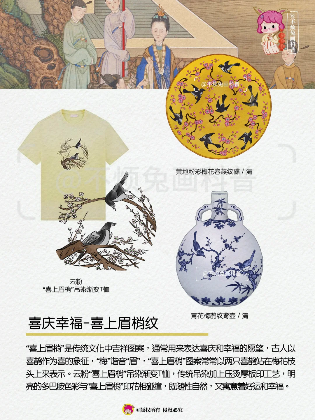 “喜上眉梢”是传统文化中吉祥图案,通常用来表达喜庆和幸福的愿望,古人以喜鹊作为喜的象征,“梅”谐音“眉”,“喜上眉梢”图案常常以两只喜鹊站在梅花枝头上来表示。云粉“喜上眉梢”吊染渐变T恤,传统吊染加上压烫厚板印工艺,明亮的多巴胺色彩与“喜上眉梢”印花相碰撞,既随性自然,又寓意着好运和幸福。