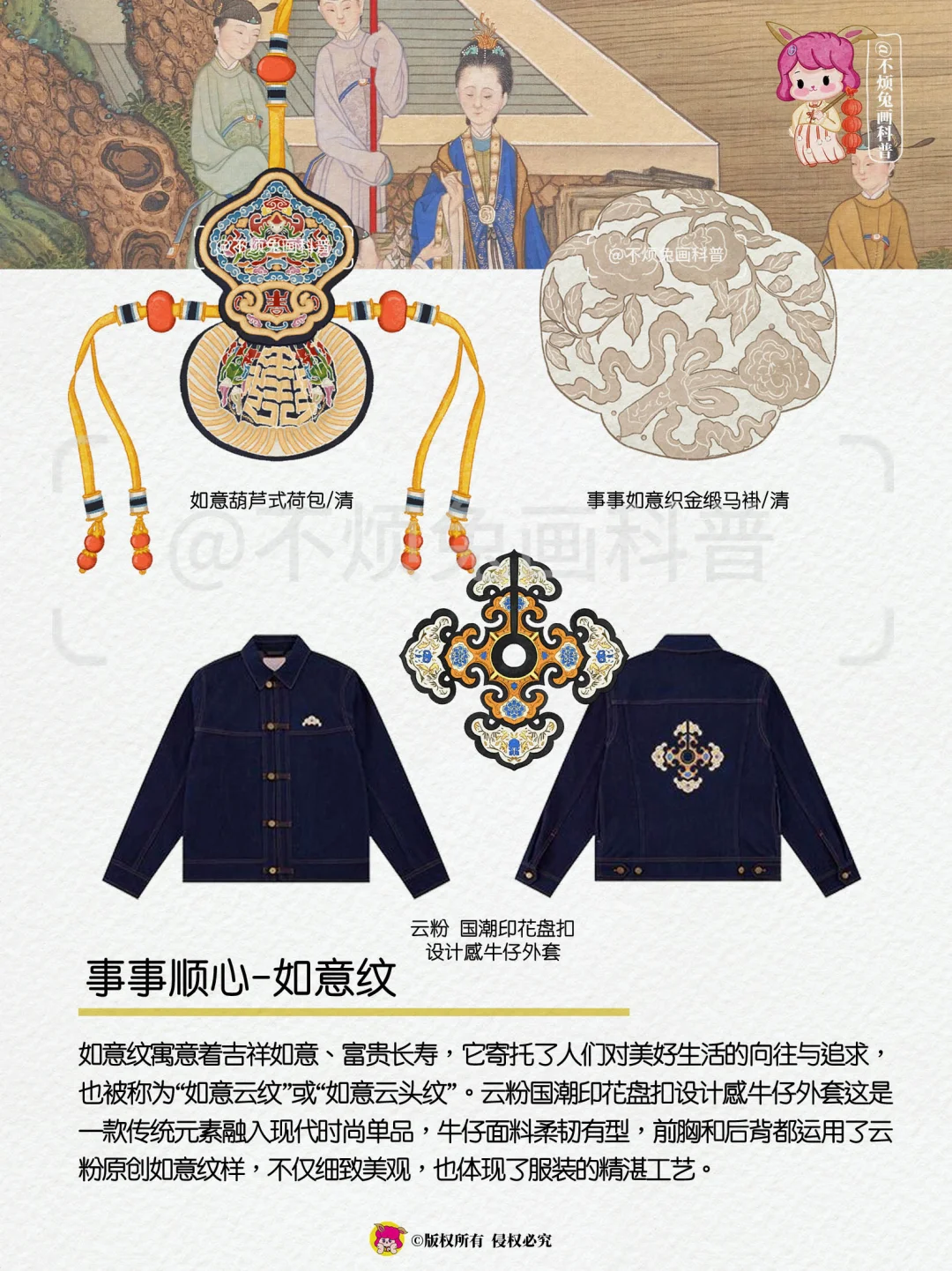 如意纹寓意着吉祥如意、富贵长寿,它寄托了人们对美好生活的向往与追求,也被称为“如意云纹”或“如意云头纹”。云粉国潮印花盘扣设计感牛仔外套这是一款传统元素融入现代时尚单品,牛仔面料柔韧有型,前胸和后背都运用了云粉原创如意纹样,不仅细致美观,也体现了服装的精湛工艺。