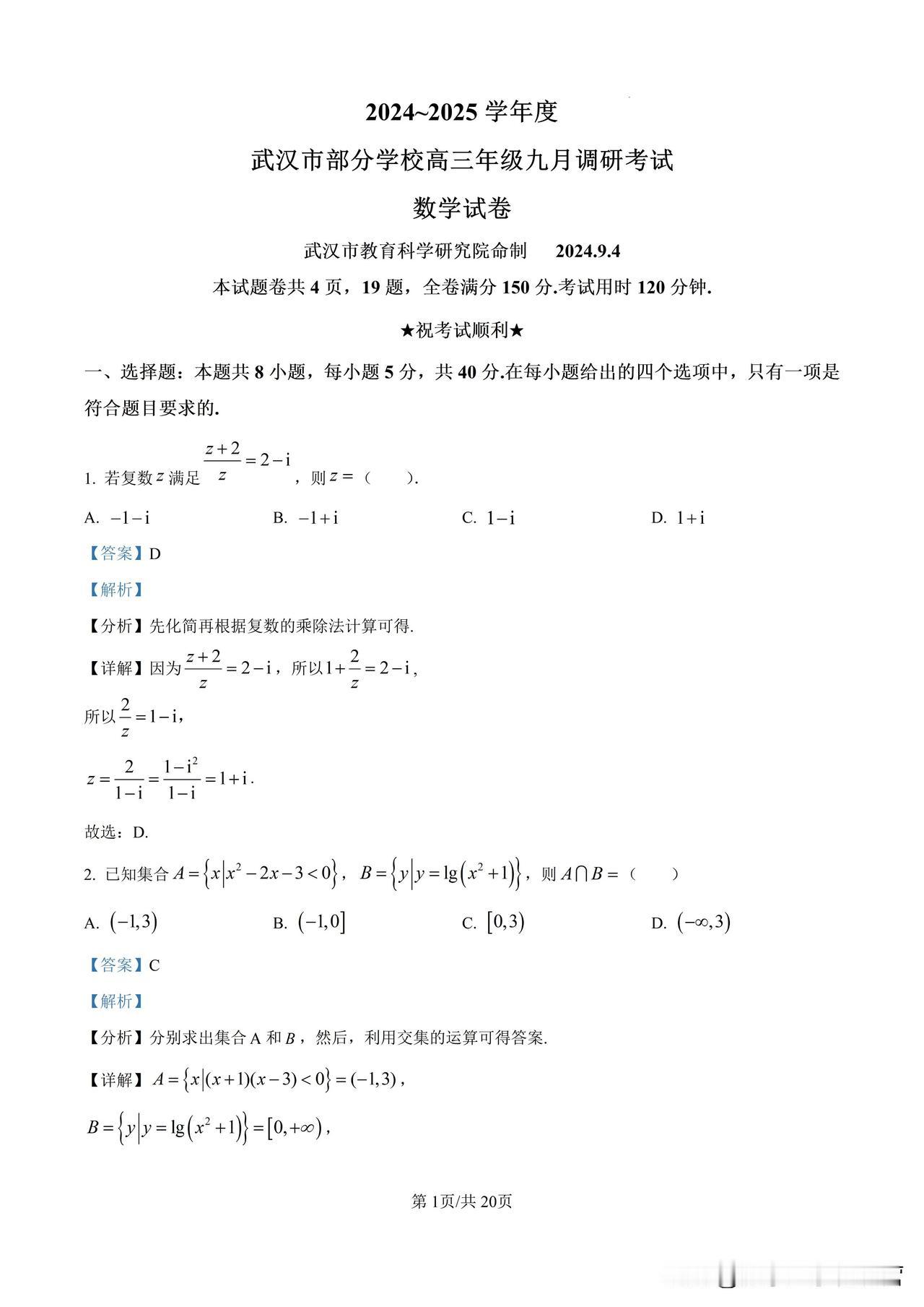 2024湖北武汉高三9月份调研考试试卷及答案详解 湖北武汉的调研卷,质量一般都