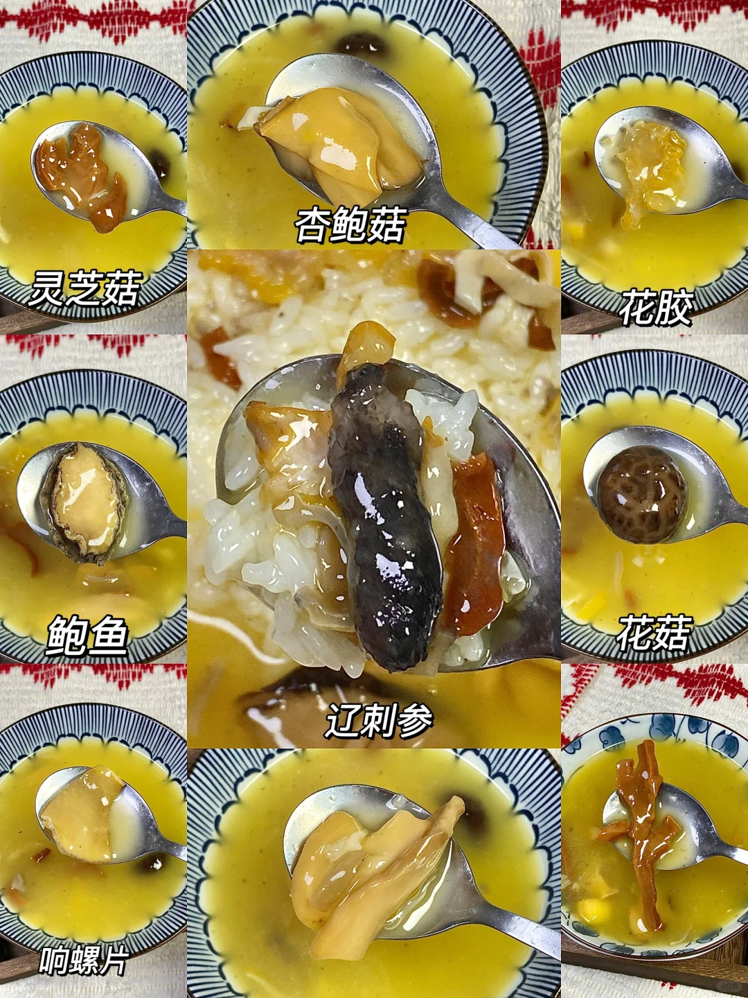 辽刺参+鲍鱼+花胶+干贝+竹耳丝+猪蹄筋+杏鲍菇+花菇+灵芝菇