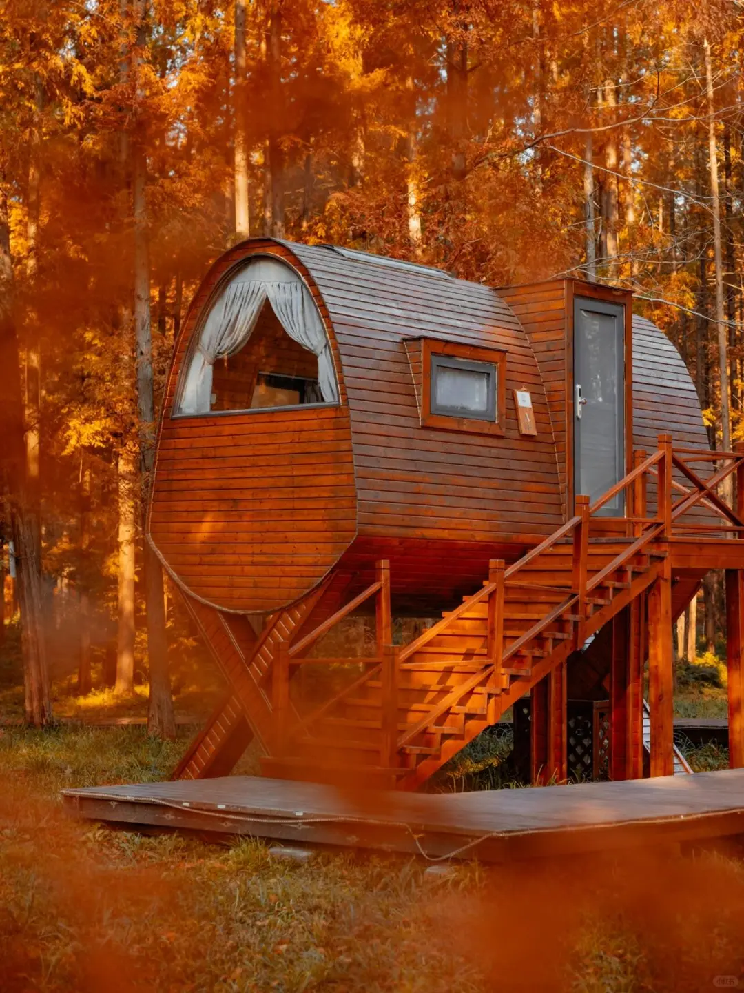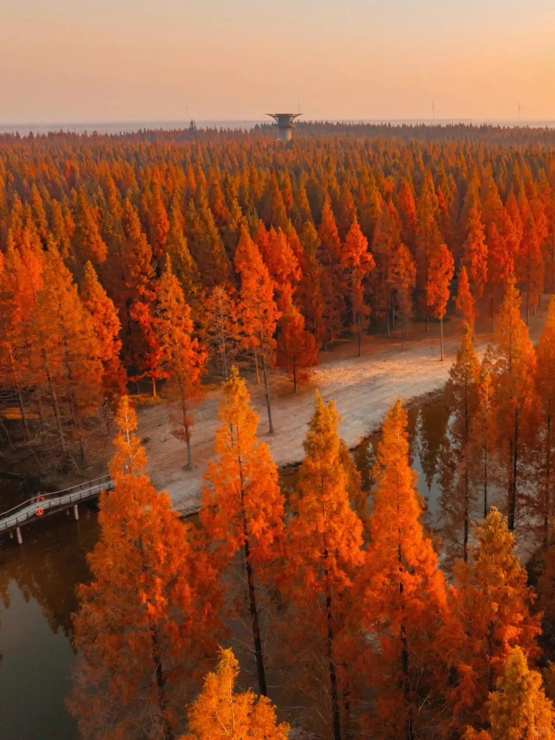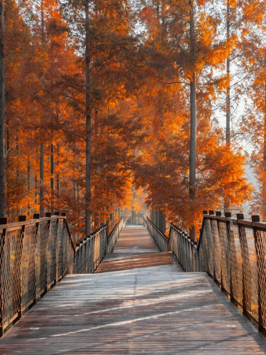 仿佛走入电影感的丛林秘境 非常适合南京周边一日游的秋冬路线🍂 . 🍁游玩路线: (公园很大,适合大半天游玩) 科普馆→水杉长廊→森林小火车→空中栈道→迷雾森林→森林之眼→木屋群落 . 🚘交通: 南京→黄海森林公园 自驾3h . 🎫门票: 50r,最佳观赏期就是12月 . 👉游玩重点: 1️⃣杉树长廊: 就在入口的位置,几公里长,这里非常出片! . 2️⃣ 森林小火车: 检票入园第一时间就可以坐观光车到森林小火车站上午的光线会比较好,穿梭水杉林中真的太童话了 . 3️⃣空中栈道: 人在栈道上面,对面拍摄,这个机位太唯美了! . 4️⃣迷雾森林: 这里航拍最为出片,特别像哈利波特电影里面的迷雾森林! . 5️⃣木屋群落: “森林里的小木屋”这个真的太梦幻了耶!仿佛闯入童话森林王国!