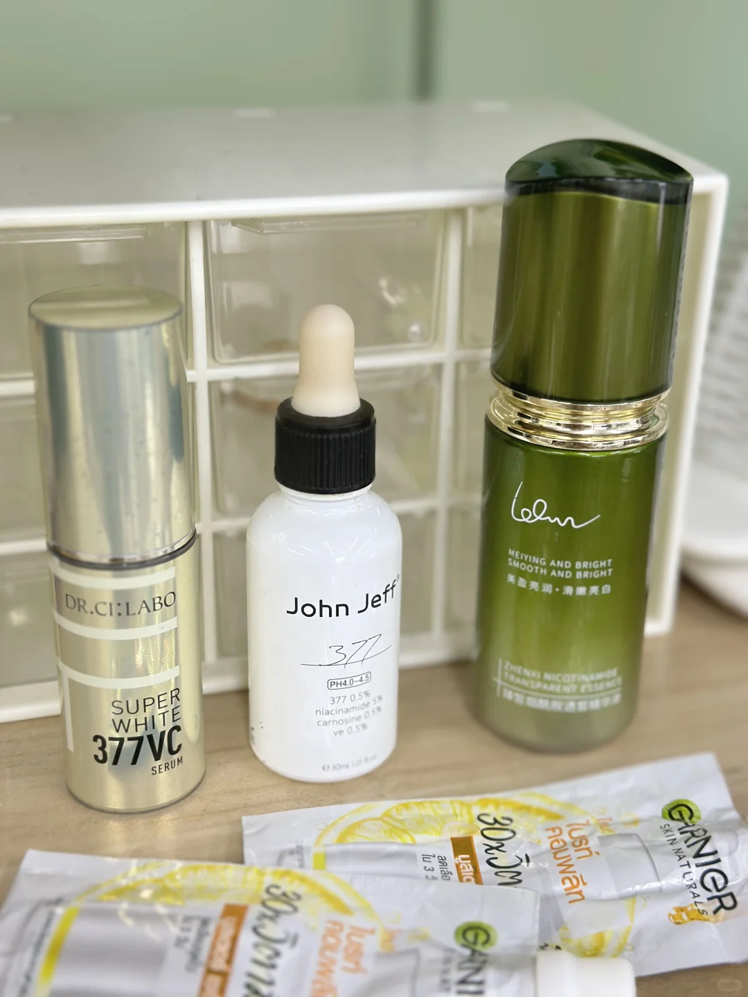 后来尝试John Jeff精华,主打成分377,我用了两周,有明显提亮效果,但是它的用料太猛了,我一个城墙皮每次都挤很多,连着用了一周脸上开始有刺痛感,宝宝们可以注意⚠️建立下耐受~