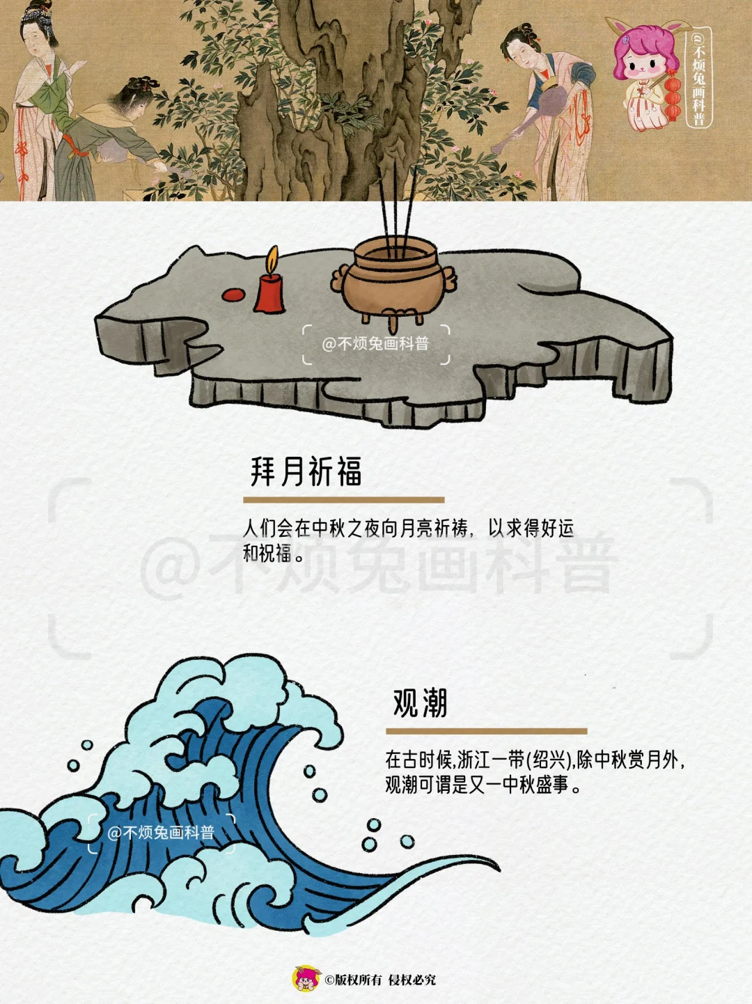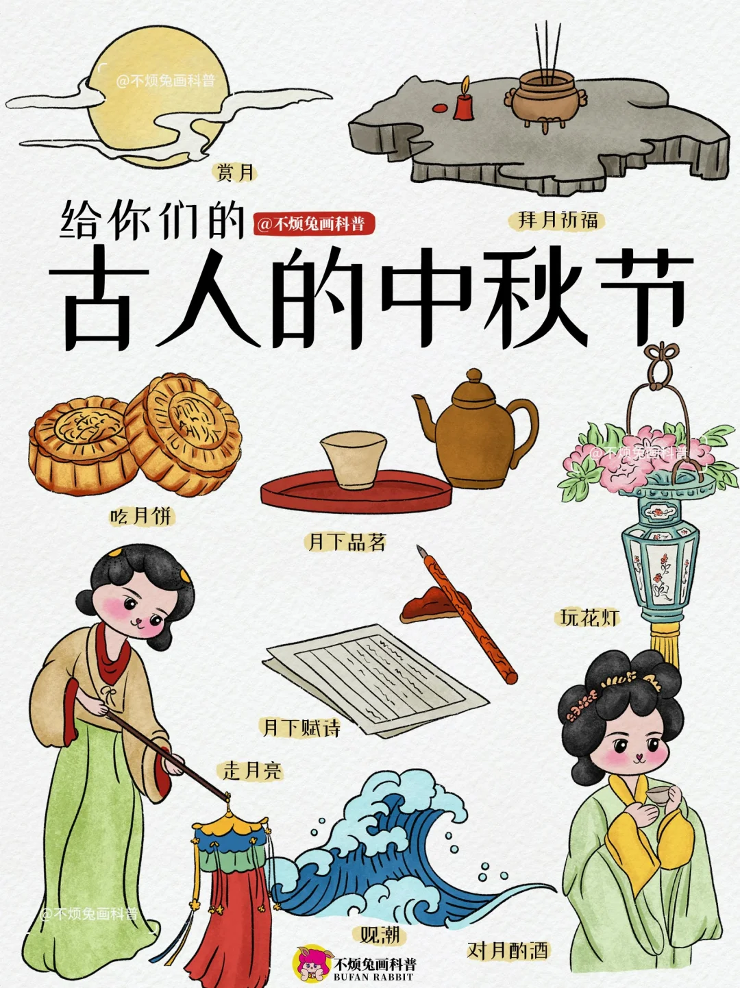 🌕中秋节始于唐朝初年,盛行于宋朝,如今成为与春节齐名的中国主要节日之一。古人中秋节都有习俗?我们一起跟不烦兔来看看吧~