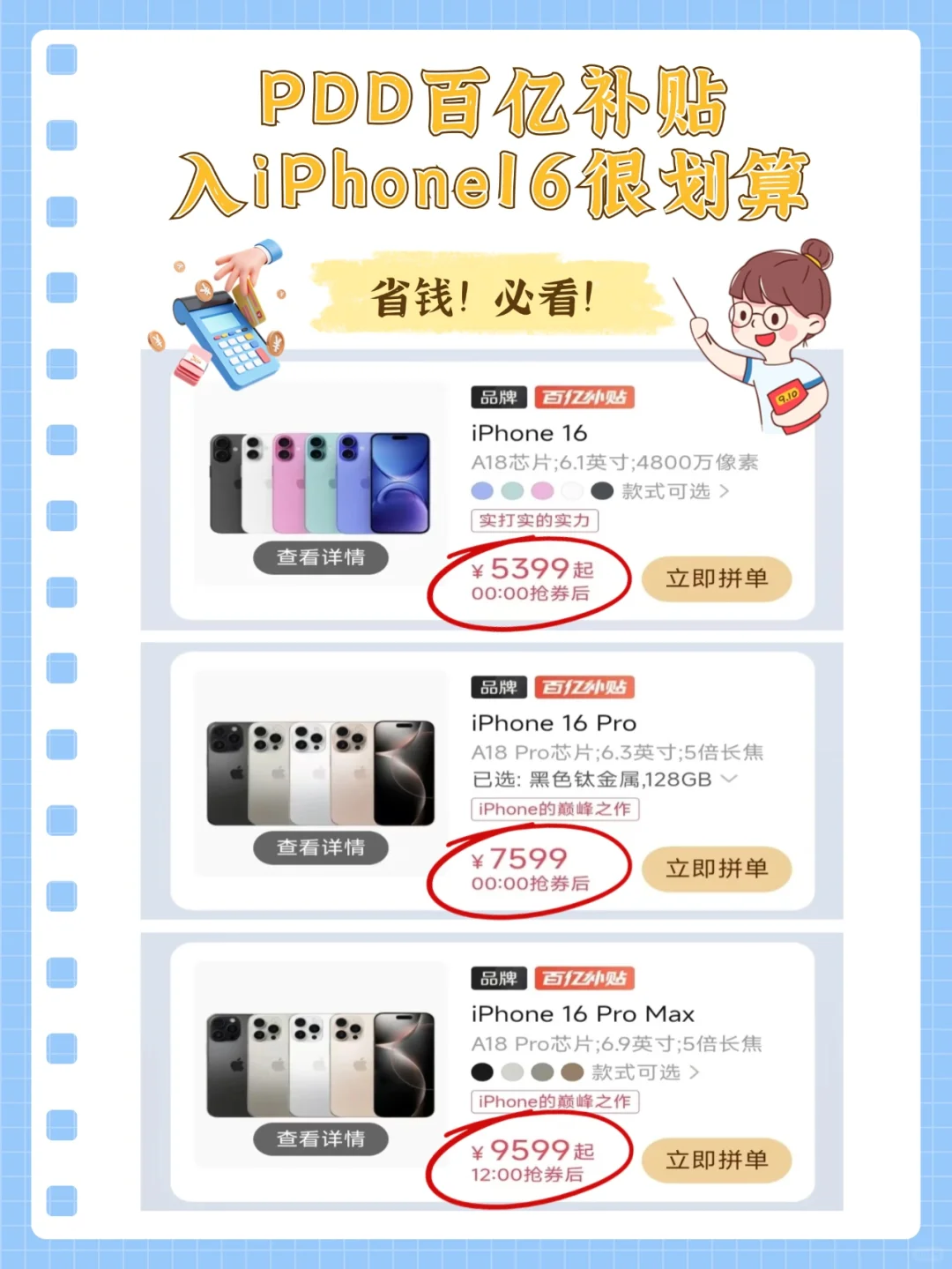 [色色R]打算入手iPhone16系列的朋友,推荐大家去PDD百亿补贴好价购入,至高直降1000元!我的iPhone和Apple watch也是在PDD百亿补贴入手的,而且PDD百亿补贴有正品发票、非新赔三、假一赔十、买贵必赔等保障,完全放心冲!