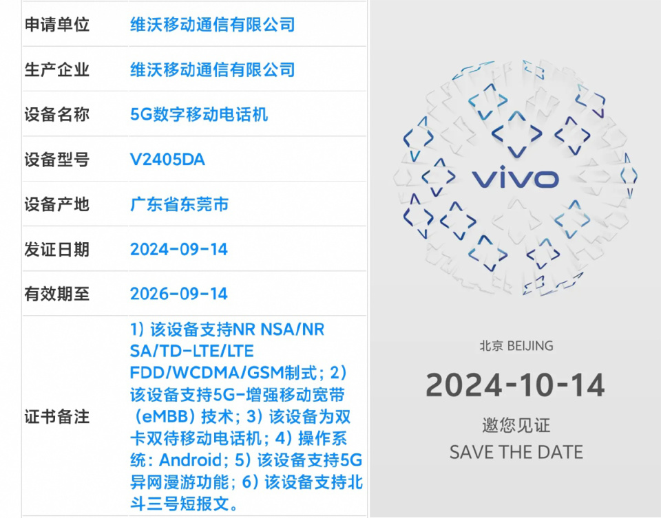 根据该博主此前曝光的信息来看,有三款型号分别为V2415A、V2405A、V2419A的新机分别于8月28日、8月30日、9月12日获得了3C认证,均支持90W有线快充,并且,这三款机型则应该分别来自vivoX200/X200mini/X200Pro。虽然该博主并未透露型号与机型的对应关系,但是根据此次曝光的于9月14日入网的型号为V2405DA的机型为vivoX200Pro卫通版来推测,此前入网的型号为V2405A的新机很可能就是vivoX200Pro版。