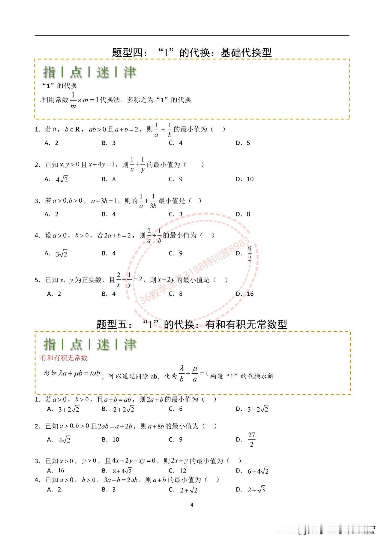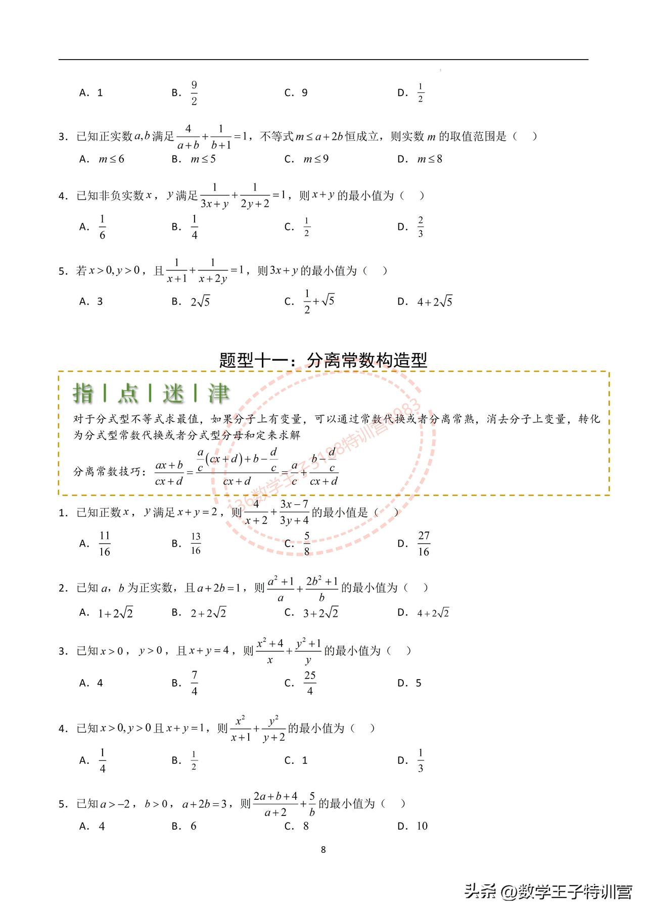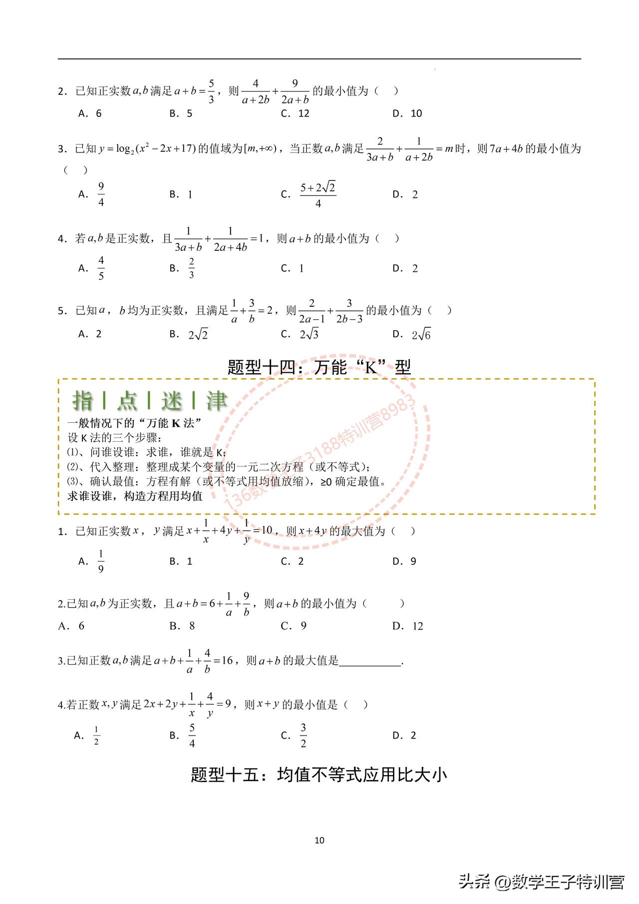 《基本不等式》是高一数学必修一的第一个难点和重点。 解题方法多,题目变化形式也多种多样,很多同学看到题目一脸懵,不知如何变形,也不知该用那种方法来解题。 而基本不等式又是求最值的常用解题工具,和后面要学的解三角形、向量、解析几何等都会联系在一起综合考查。 最重要的是,基本不等式对同学们的灵活运用能力要求比较高,要会分析题目,根据所学的知识和方法来进行解题。这一点是最关键的。 每年到了基本不等式的时候,都会有大量的高一孩子说基本不等式太难了,打死我也想不到,简直就是“基本不懂事”。 学好基本不等式的方法也有,就是多看多听多学,有些方法你没见过,是无论如何都想不到的。 这边有50个讲解视频,11种解题方法,把基本不等式常见的题型和方法都归纳总结好了。认真学两遍,轻松拿下基本不等式。 需要的可以回复“想学”,一起学好基本不等式。