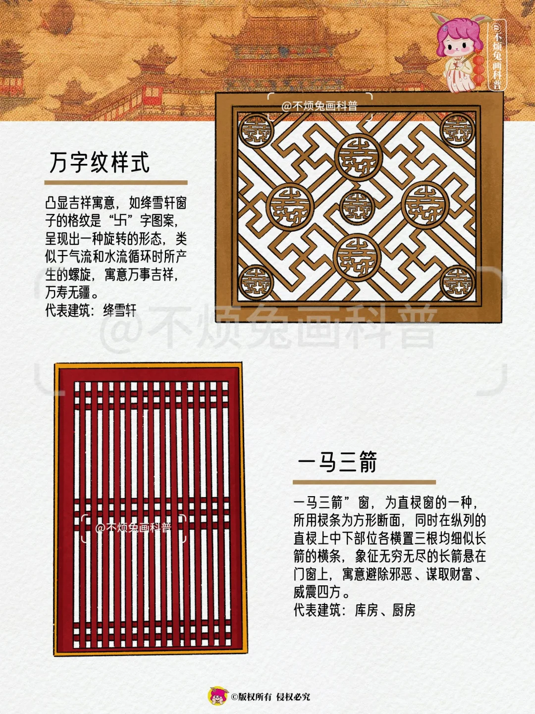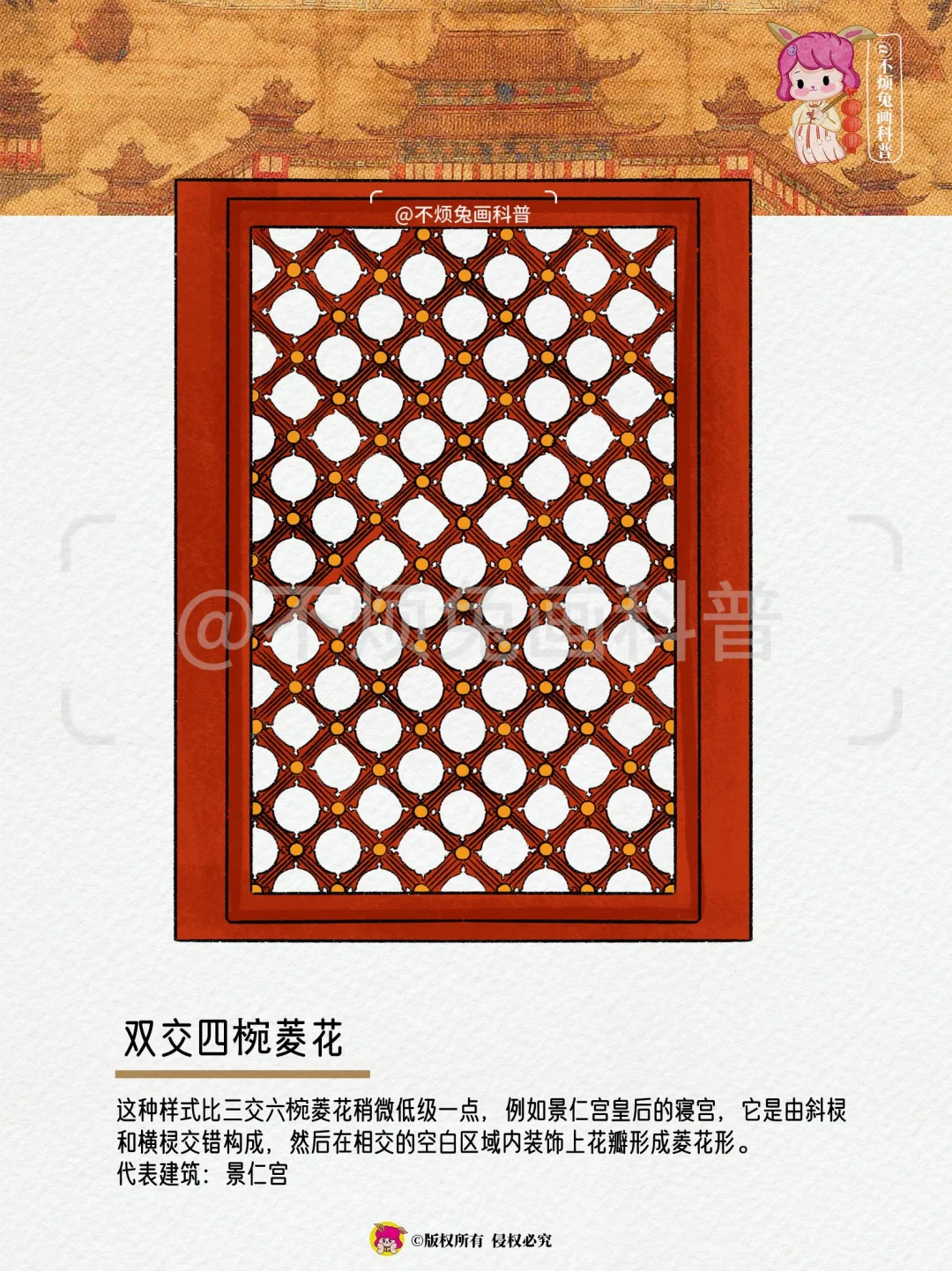 ⛩故宫的窗棂设计非常讲究,它们不仅仅是建筑的一部分,更是文化和艺术的体现。故宫窗棂的种类和样式丰富多样,每一种都有其独特的寓意和象征,可以根据门窗上的花窗纹样的级别和纹样特征来判断所属房间主人的地位,今天跟着不烦兔一起来看看吧~
