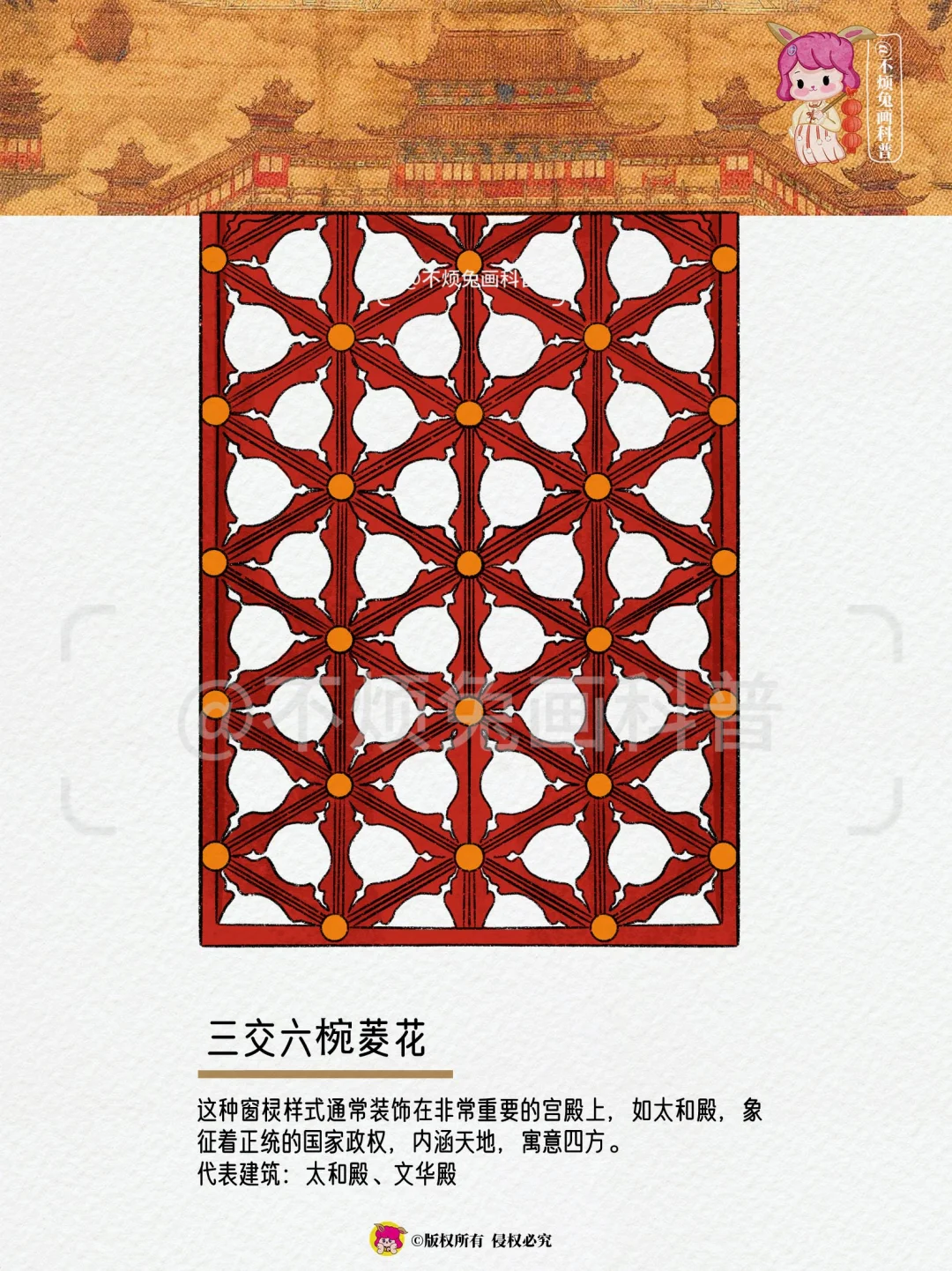 这种窗棂样式通常装饰在非常重要的宫殿上,如太和殿,象征着正统的国家政权,内涵天地,寓意四方。