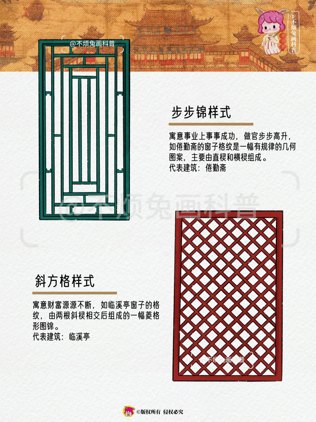 寓意事业上事事成功,做官步步高升,如倦勤斋的窗子格纹是一幅有规律的几何图案,主要由直棂和横棂组成。