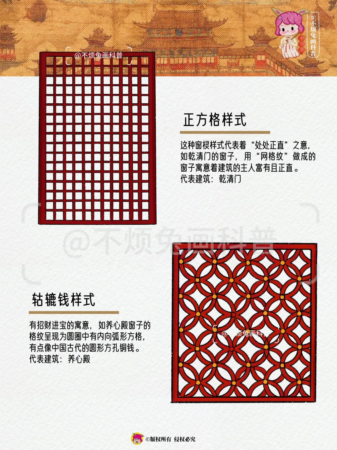 这种窗棂样式代表着“处处正直”之意,如乾清门的窗子,用“网格纹”做成的窗子寓意着建筑的主人富有且正直。