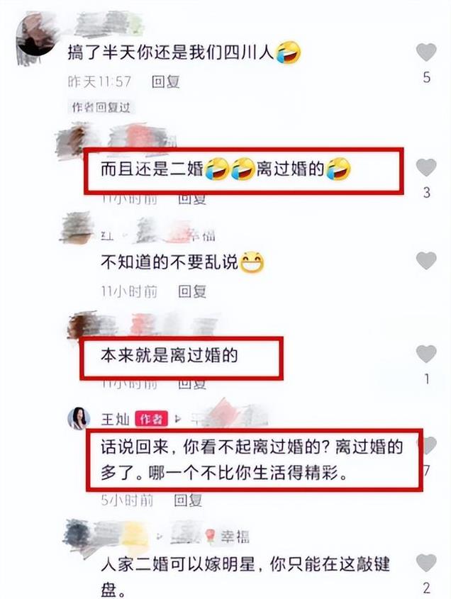 也不知道网友们都在想什么,难道是看不惯他人过得好吗?对此王灿也丝毫不在乎直接回复:话说回来,你是看不起离过婚的?离过婚的多了,哪一个不比你生活得精彩。