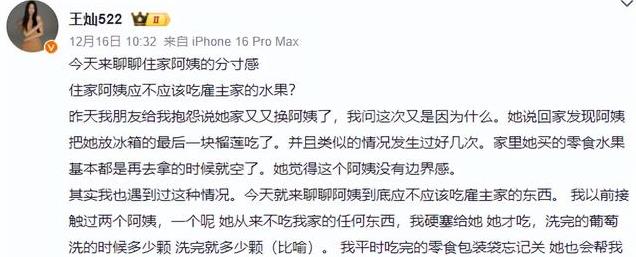 《今天来聊聊住家阿姨的分寸感》,微博王灿,2024-12-16发布
