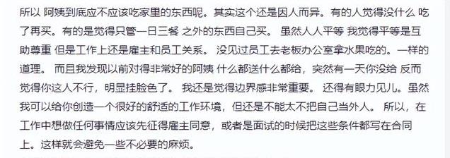 以上就是最基本作为一个合格的保姆应有的职责和行为规范礼仪,那么结合王灿所说的,她所请的阿姨就是不太规范的,在她发文中所提到的阿姨并没有做到以上的保持礼貌和分寸,而是自己吃水果,且没有给主家留。