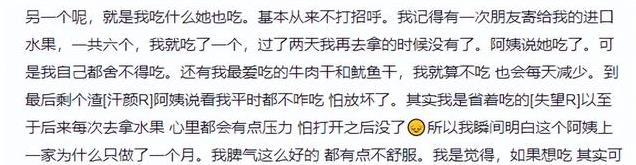 在王灿和自己朋友的一次聊天中,朋友向她抱怨说自己家又又换阿姨了,原因是阿姨把她家放在冰箱的最后一块榴莲吃完了,而且这类事情发生了很多次,家里买的零食水果基本都是朋友再去拿的时候就没了,觉得阿姨很没有礼貌。