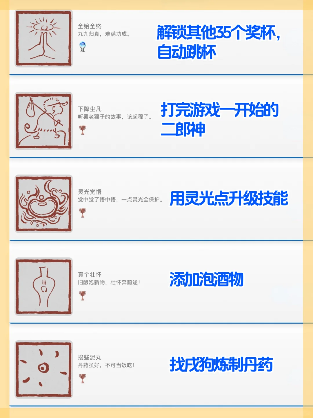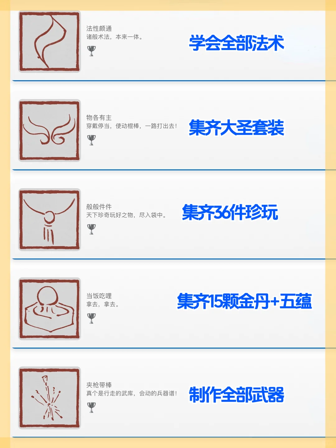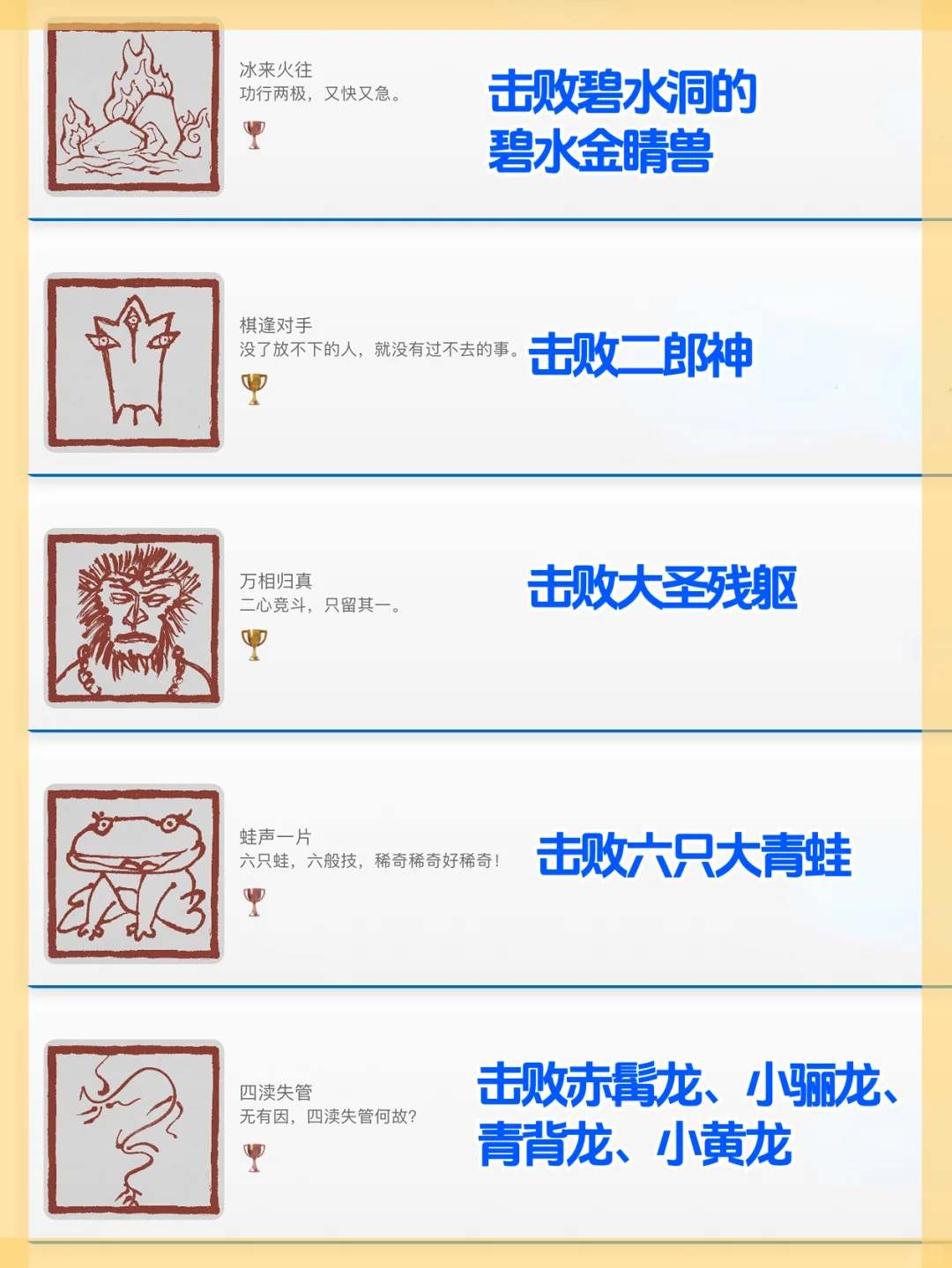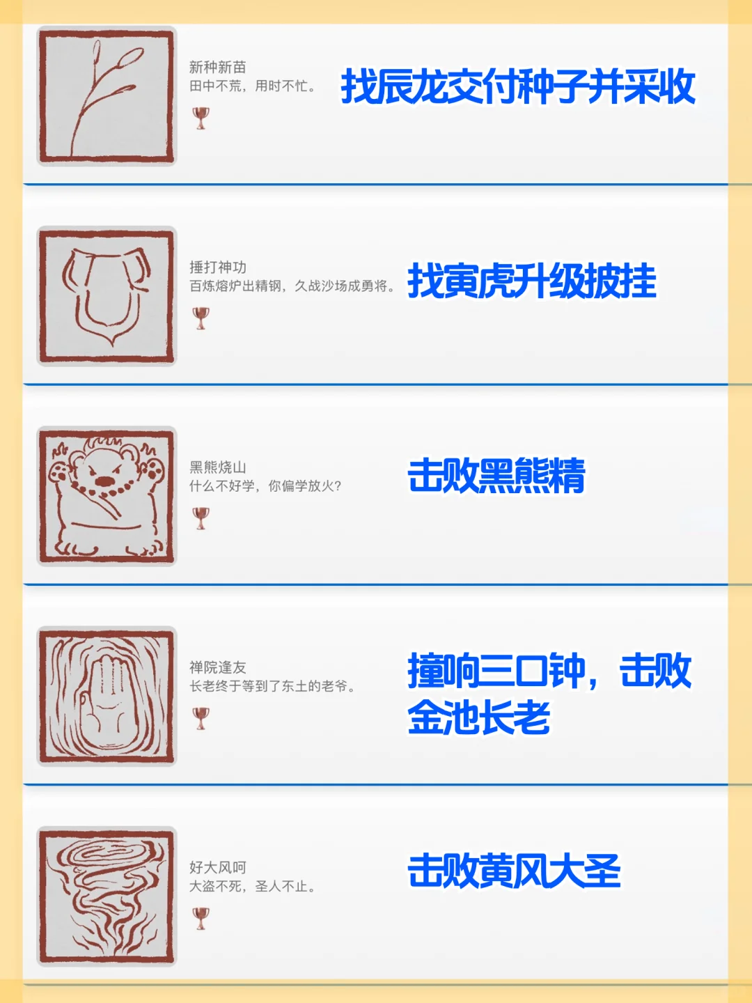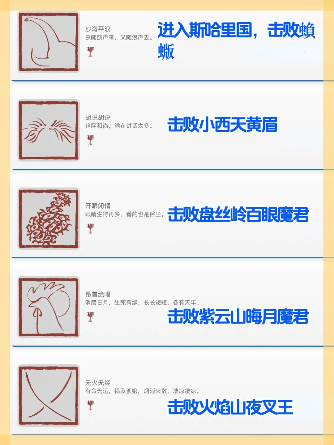 人物:大圣残躯(完成任务,二周),袁守诚(5次见面,并解锁全部影神图),鹤仙人(四妹支线),马天霸(5次见面)