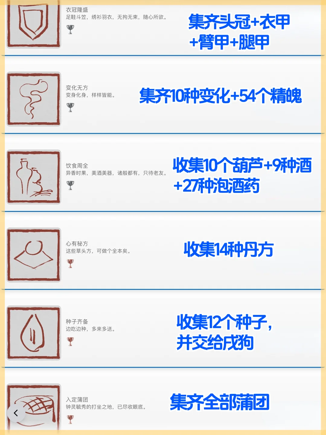 饮食周全:收集10个葫芦+9种酒+27种泡酒药。击杀毒敌大王后可得彩玉葫芦,须打晦月魔君前完成。收集齐9个葫芦后,再找猴子买青田葫芦。二周找猴子买净瓶柳叶。