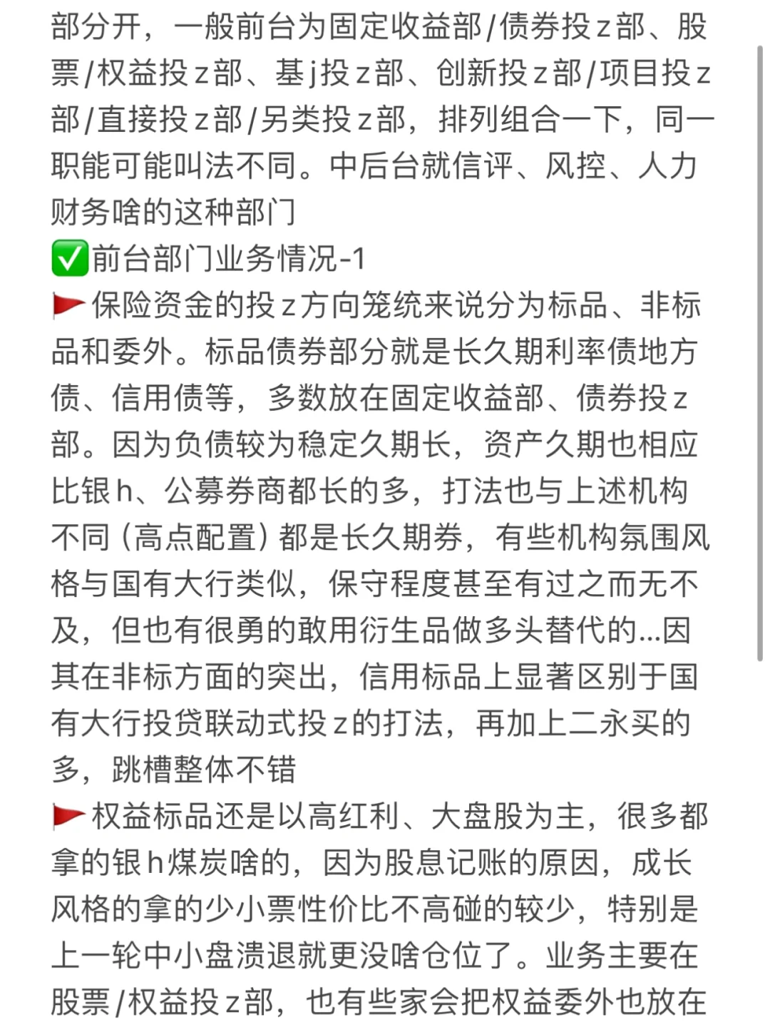 🚩险资资管设置有点迷,经常资产、资本、投控一锅炖(说的就是你人保)每家谁好谁坏不能一概而论,为了方便这里只介绍传统的资产公司。部门分类一般和公募差不多(功能有差异)甚至像泰康这种有公募产品的还会把保险资管和公募事业部分开,一般前台为固定收益部/债券投z部、股票/权益投z部、基j投z部、创新投z部/项目投z部/直接投z部/另类投z部,排列组合一下,同一职能可能叫法不同。中后台就信评、风控、人力财务啥的这种部门