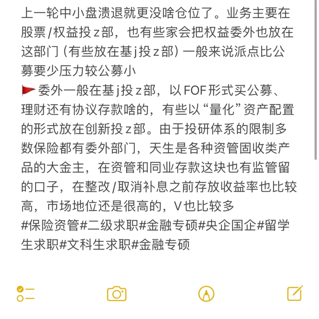 🚩委外一般在基j投z部,以FOF形式买公募、理财还有协议cun款啥的有些以“量化”资产配置的形式放在创新投z部。由于投研体系的限制多数险资都有委外部门,天生是各种资管固收类产品的大金主,在资管和同业存款这块也有监管留的口子,在整改/取消补息之前存放收益率也比较高,市场地位还是很高的,V也比较多