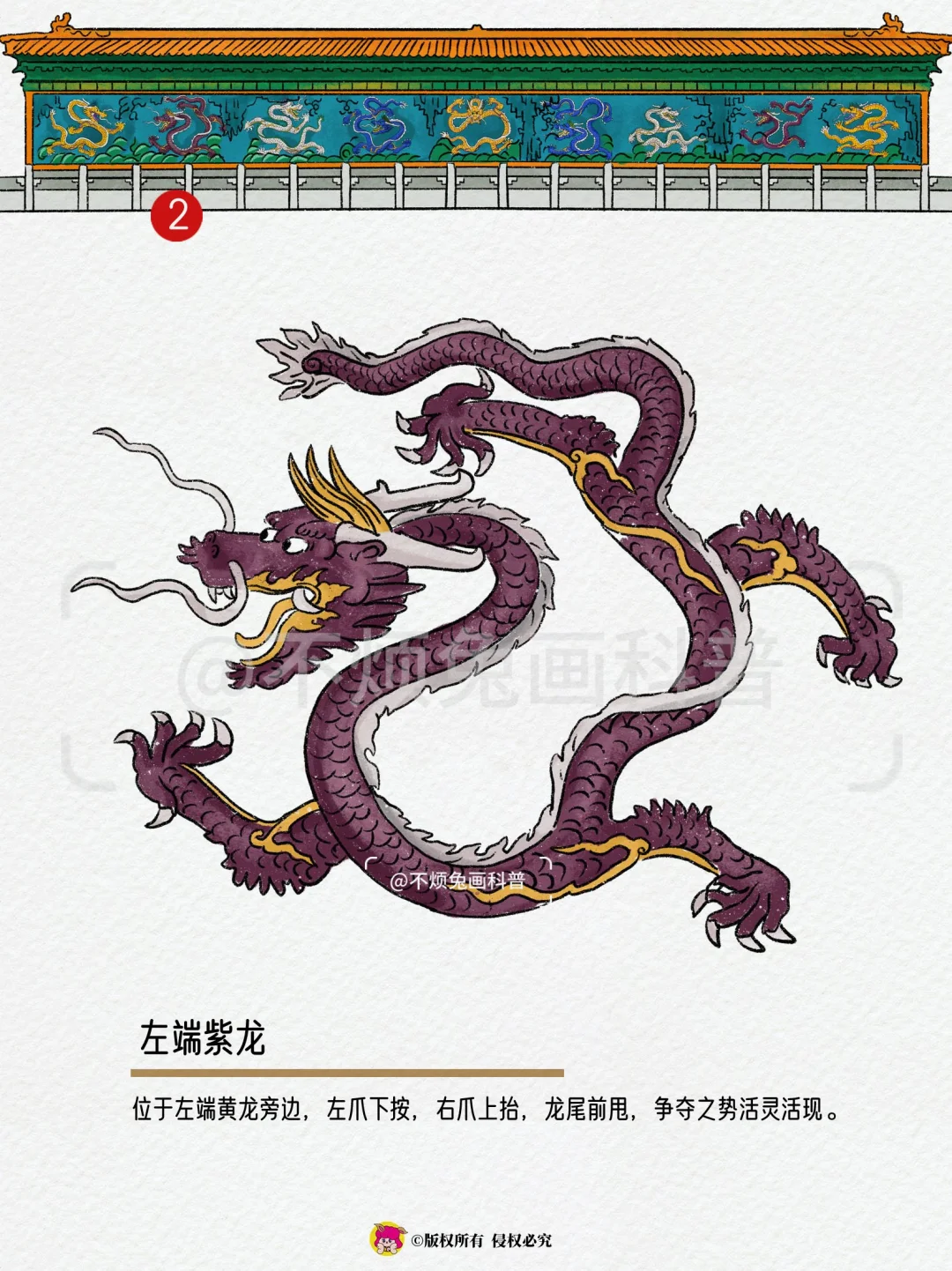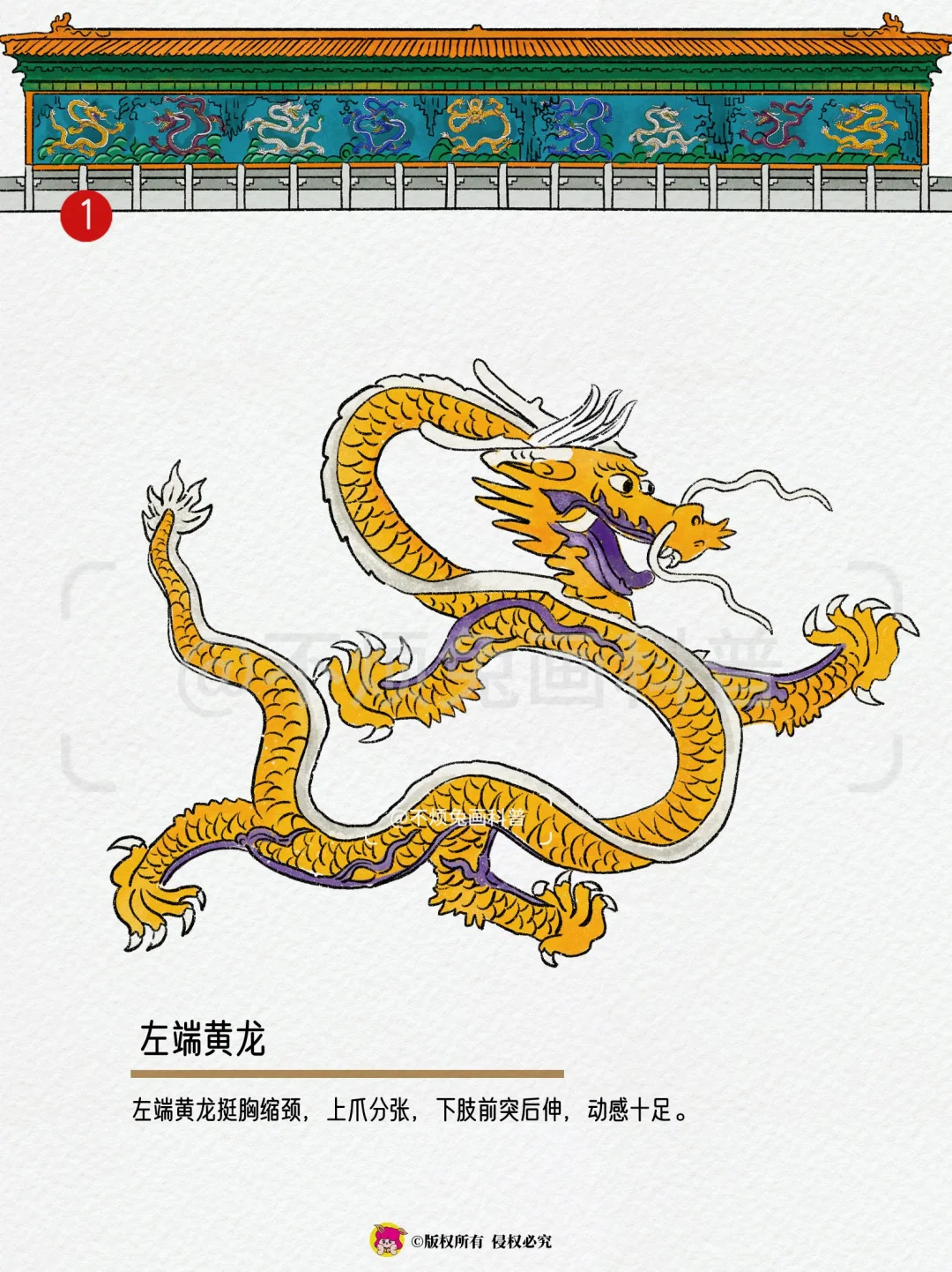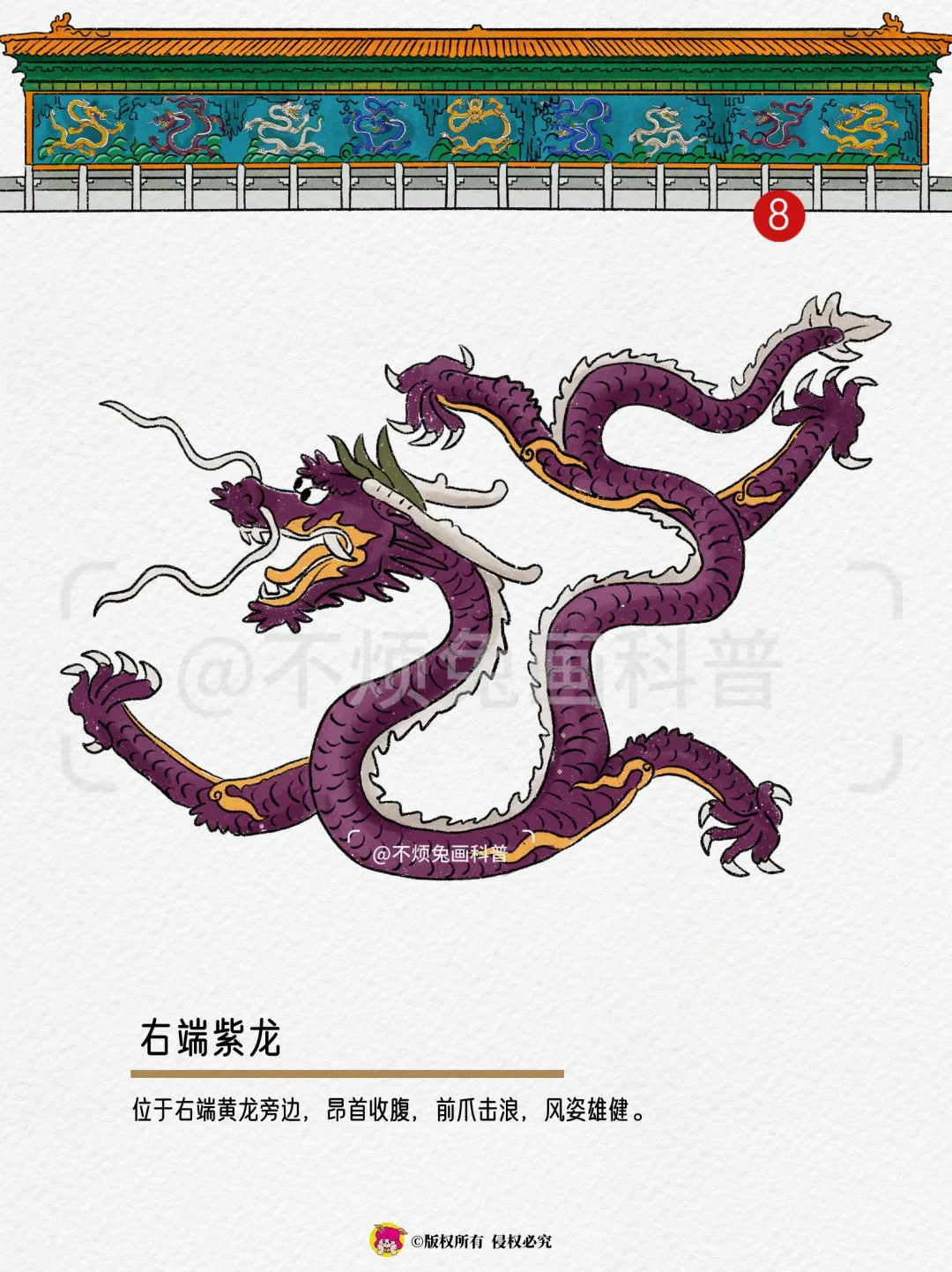 🐲九龙壁位于紫禁城宁寿宫区皇极门外。壁长29.4m,高3.5m,厚0.45m,是一座背倚宫墙而建的单面琉璃影壁,为乾隆三十七年(1772年)改建宁寿宫时烧造。壁上部为黄琉璃瓦庑殿式顶,檐下为仿木结构的椽、檩、斗栱。壁面以云水为底纹,分饰蓝、绿两色,烘托出水天相连的磅礴气势。其中一条龙隐藏着秘密,今天和不烦兔一起看看吧。