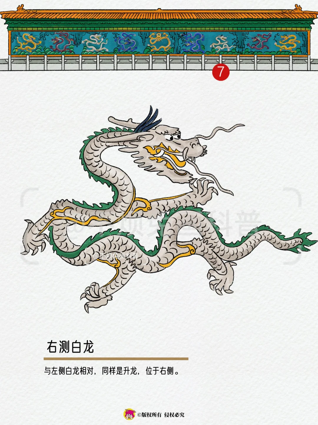 作为升龙,位于左侧,与右侧的蓝龙对称,龙身向上,呈上升之势。值得一题的是这条白龙腹部有一块是木质的。