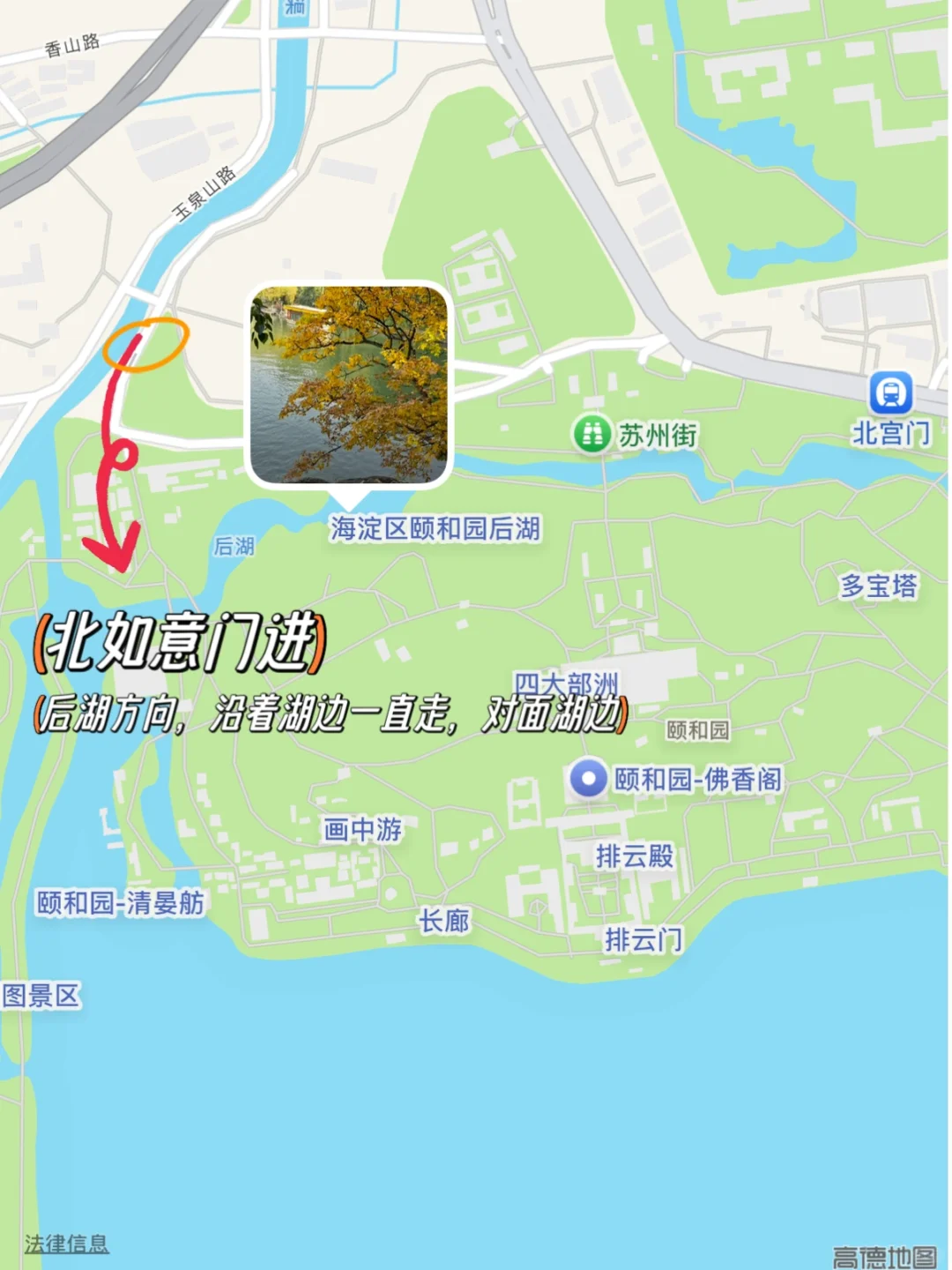 从北如意门过半壁桥去后湖,沿着小路一直走,也可以导航到绮望轩址,出片机位在湖边〽️