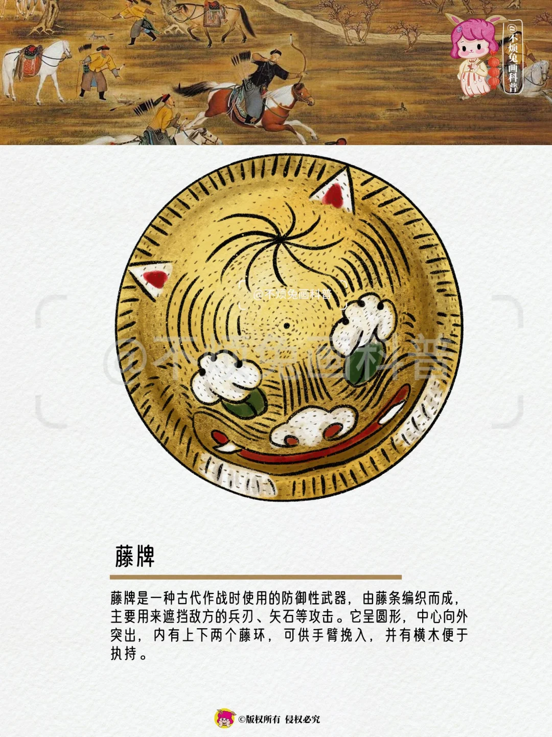 藤牌是一种古代作战时使用的防御性武器,由藤条编织而成,主要用来遮挡敌方的兵刃、矢石等攻击。它呈圆形,中心向外突出,内有上下两个藤环,可供手臂挽入,并有横木便于执持。