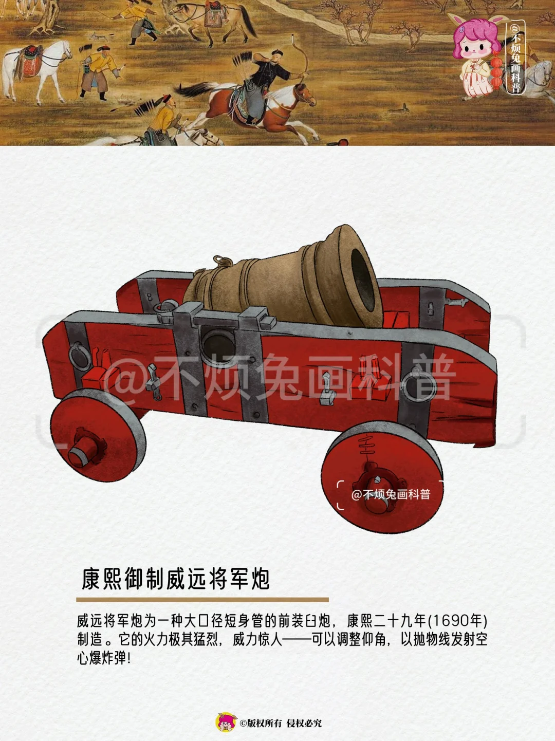 威远将军炮为一种大口径短身管的前装臼炮,康熙二十九年(1690年)制造。它的火力极其猛烈,威力惊人——可以调整仰角,以抛物线发射空心爆炸!