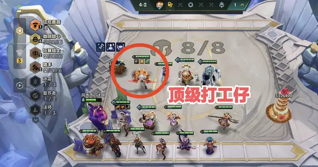 4-2又是彩色海克斯,拿下投资++,拉8级大D一波,估计是狗运用完了,80块D出了两星奥拉夫,一张格温和一张剑姬,只能说6咖啡凑齐了。