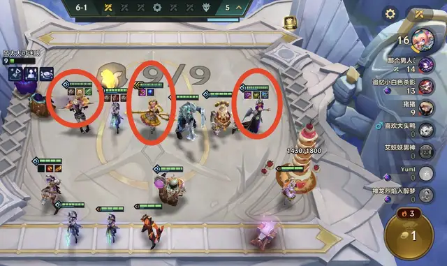 6-1外面出了3星滑板鞋,由于一直喂贝蕾亚,血量并不健康,6-1开始梭哈找三星格温,刚好格温吃妮蔻三星之后,又D出了4变5法杖。