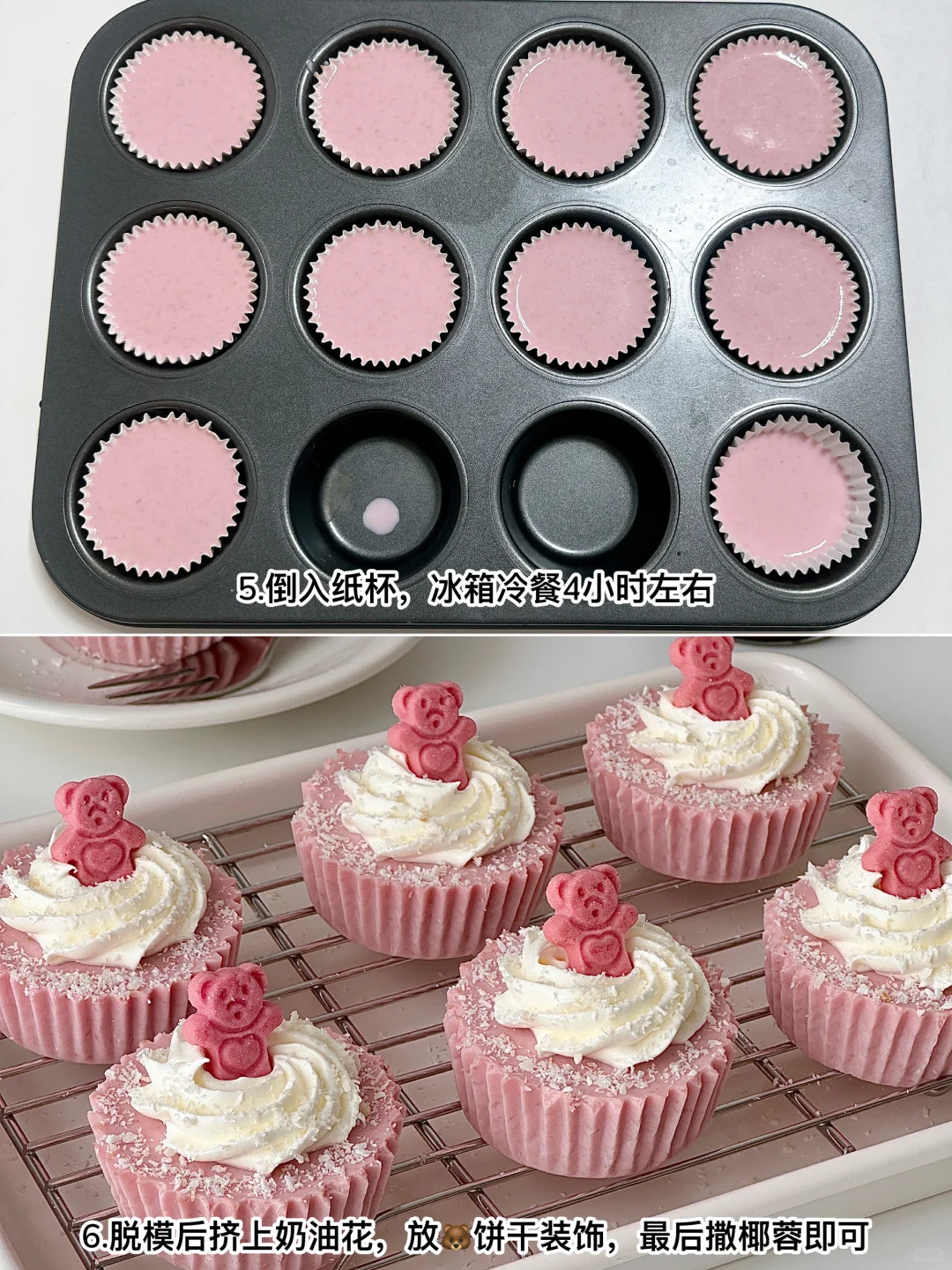❷吉利丁片提前冷水泡软,与热牛奶混合搅拌融化,倒入步骤1里混合后倒入纸杯里,放放冰箱冷藏4小时左右后脱模