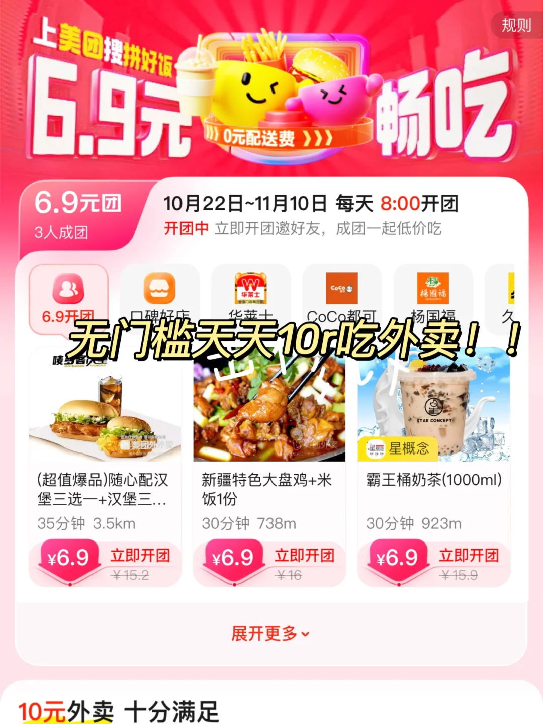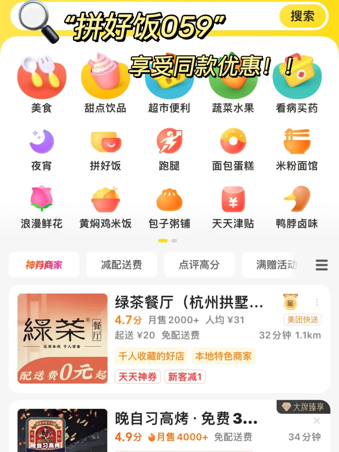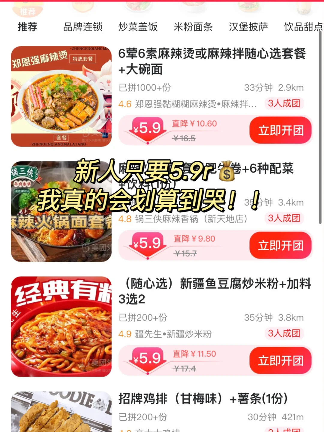 谁懂啊啊 打工人中午点外卖有自己的省钱法子 拼好饭真是解救了每个打工人! 二话不说 直接分享🔽 ⏰10月22日-11月10日 🍃地区:杭州 💡新人领6r🧧,5.9r吃全场! 💡老客邀好友参团,6.9r吃全场! 💡还有天天无门槛10r吃外卖! 上美团/美团外卖🔍【拼好饭059】就能享受同款优惠咯! 我今晚点两样都不到20r,夜宵党幸福住了! 还有各类奶茶甜品,饭菜都便宜到哭! 需要的姐妹们去看看! - 🥣张亮麻辣烫/杨国福麻辣烫/子固路拌粉/花小小新疆炒米粉任你点!