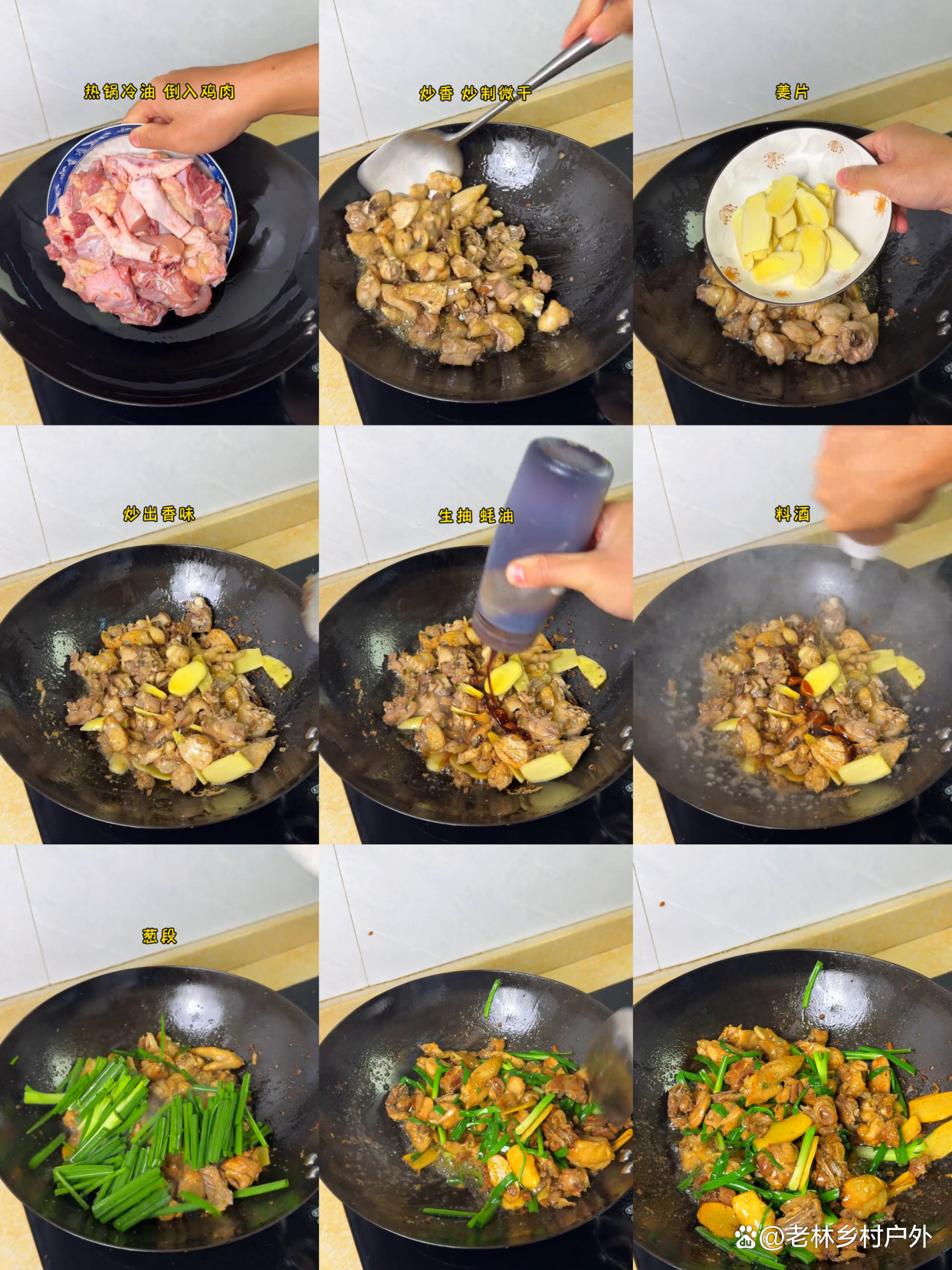 第一步,起锅烧油,把切好的鸡肉块放进油锅中,炒出鸡油,有些微焦的状态。