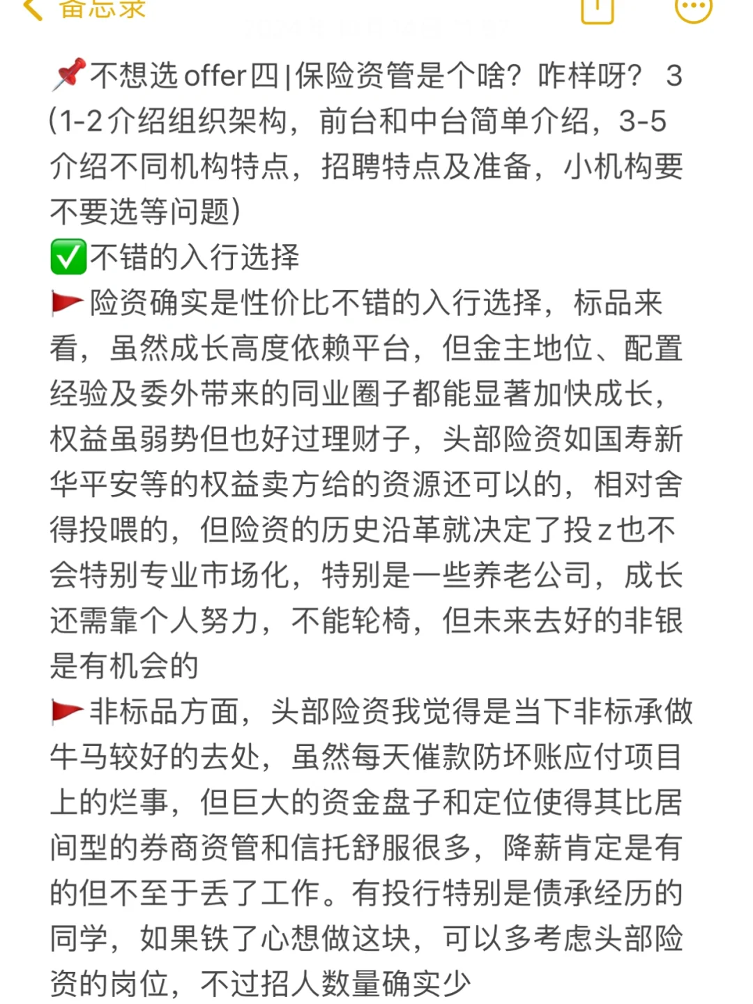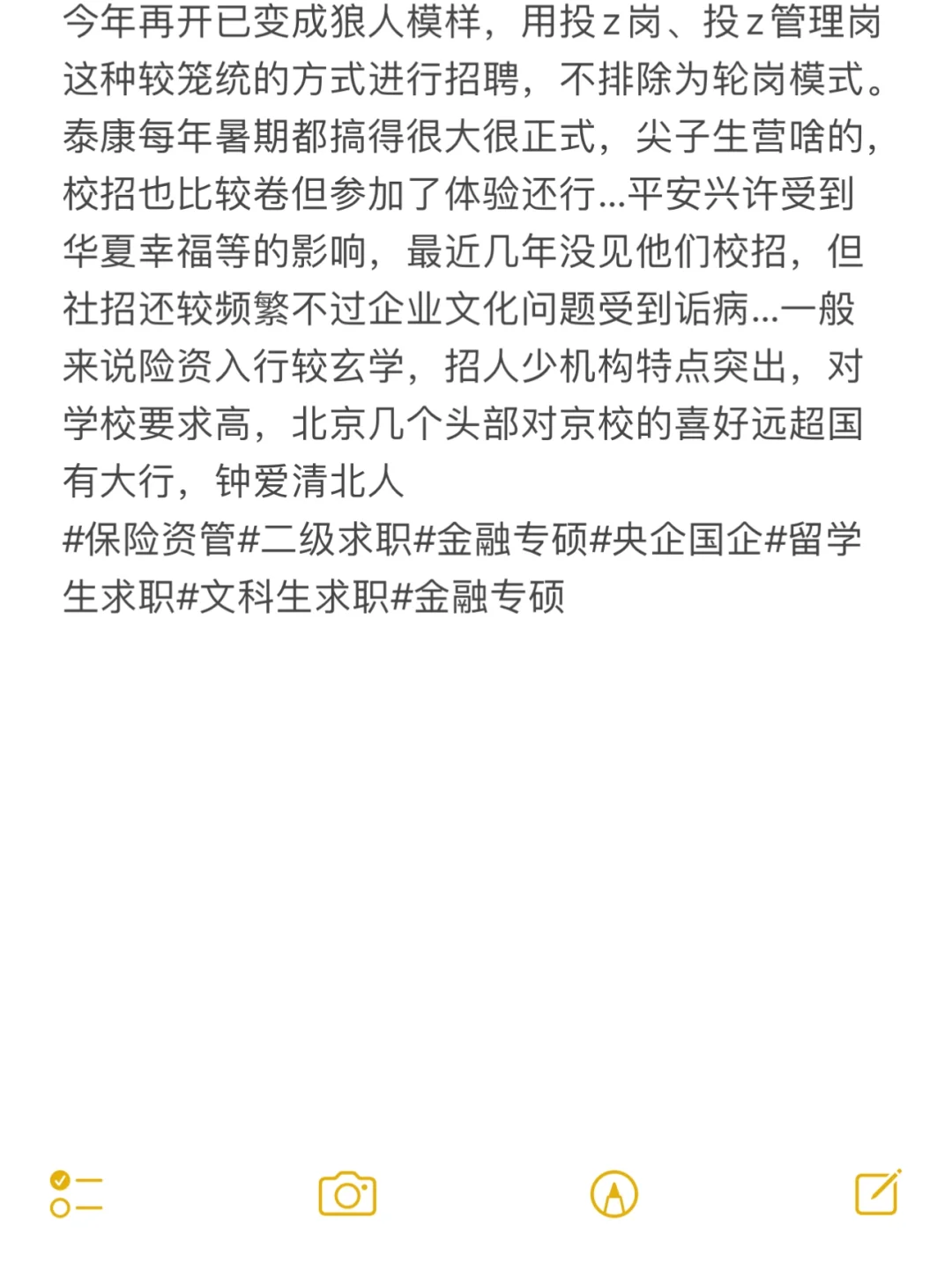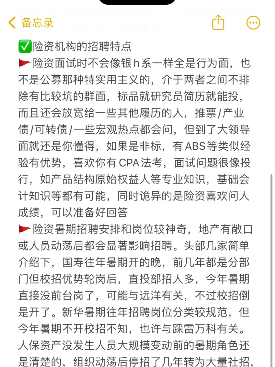 🚩险资暑期招聘安排和岗位较神奇,地产有敞口或人员动荡后都会显著影响招聘。头部几家简单介绍下,国寿往年暑期开的晚,前几年都是分部门但校招优势轮岗后,直投部招人多,今年暑期直接没前台岗了,可能与远洋有关,不过校招倒是开了。新华暑期往年招聘岗位分类较规范,但今年暑期不开校招不知,也许与踩雷万科有关。人保资产没发生人员大规模变动前的暑期角色还是清楚的,组织动荡后停招了几年转为大量社招,今年再开已变成狼人模样,用投z岗、投z管理岗这种较笼统的方式进行招聘,不排除为轮岗模式。泰康每年暑期都搞得很大很正式,尖子生营啥的,校招也比较卷但参加了体验还行…平安兴许受到华夏幸福等的影响,最近几年没见他们校招,但社招还较频繁不过企业文化问题受到诟病…一般来说险资入行较玄学,招人少机构特点突出,对学校要求高,北京几个头部对京校的喜好远超国有大行,钟爱清北人