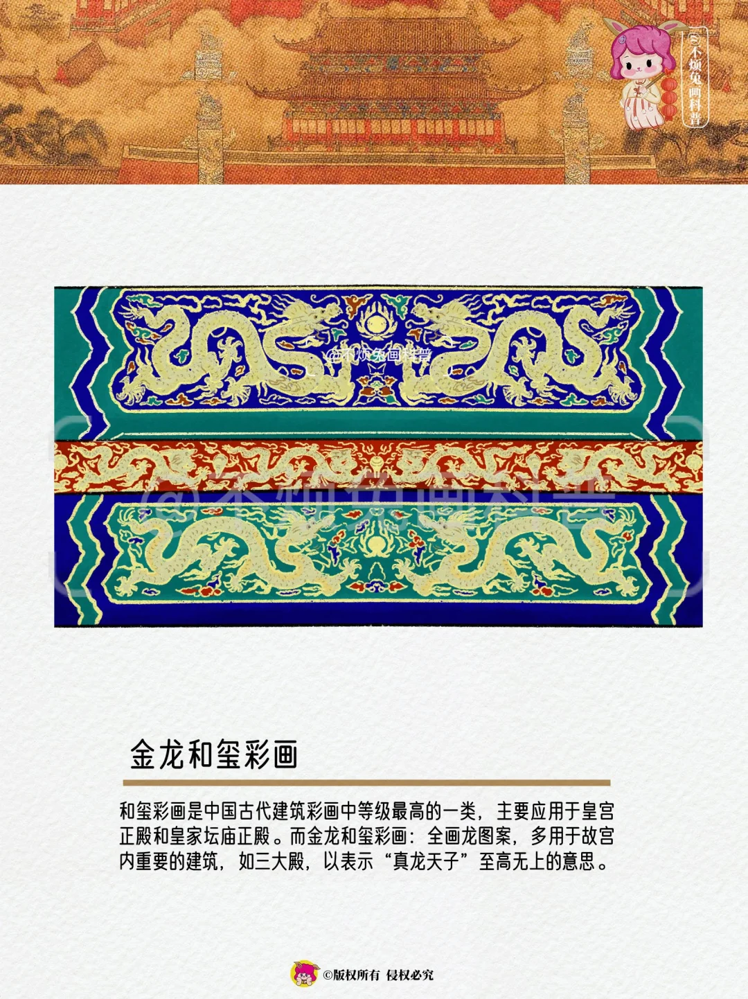和玺彩画是中国古代建筑彩画中等级最高的一类,主要应用于皇宫正殿和皇家坛庙正殿。而金龙和玺彩画:全画龙图案,多用于故宫内重要的建筑,如三大殿,以表示“真龙天子”至高无上的意思。