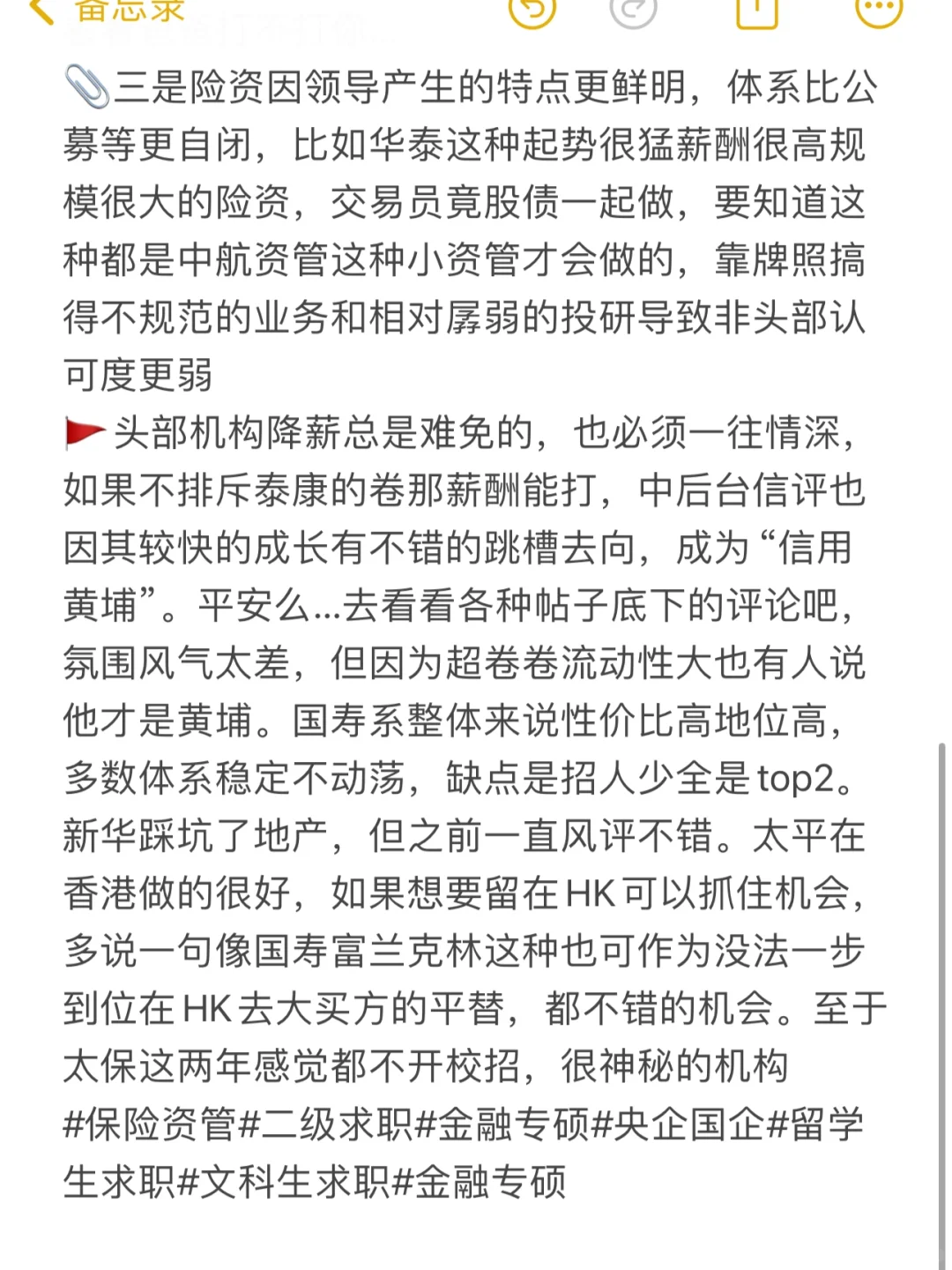 🚩头部机构降薪总是难免的,也必须一往情深,如果不排斥泰康的卷那薪酬能打,中后台信评也因其较快的成长有不错的跳槽去向,成为“信用黄埔”。平安么…去看看各种帖子底下的评论吧,氛围风气太差,但因为超卷卷流动性大也有人说他才是黄埔。国寿系整体来说性价比高地位高,多数体系稳定不动荡,缺点是招人少全是top2。新华踩坑了地产,但之前一直风评不错。太平在香港做的很好,如果想要留在HK可以抓住机会,多说一句像国寿富兰克林这种也可作为没法一步到位在HK去大买方的平替,都不错的机会。至于太保这两年感觉都不开校招,很神秘的机构