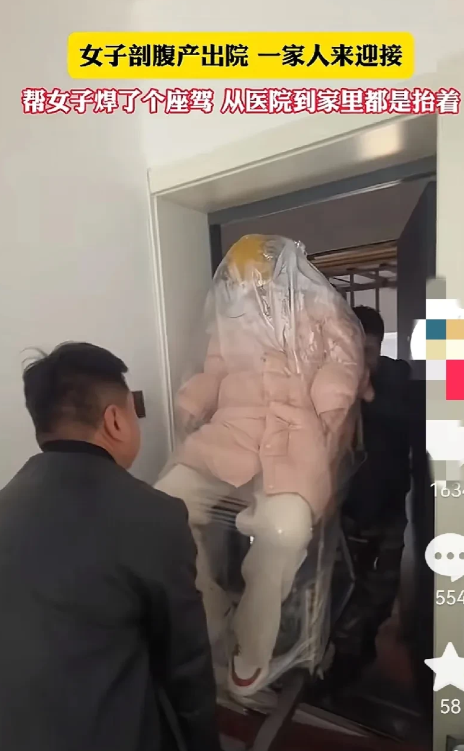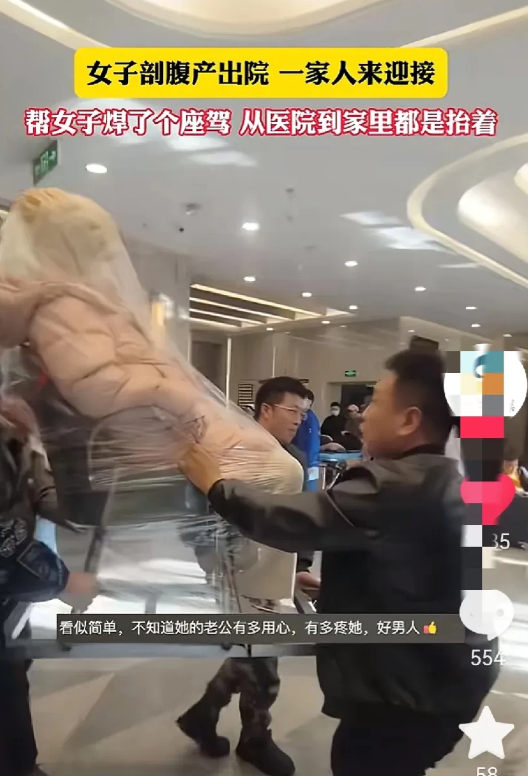 有网友说太夸张了。对,虽然看上去是夸张。但这不是产妇能不能走的问题,而是老公家人重视她,宠爱她,把她放在了心坎上。