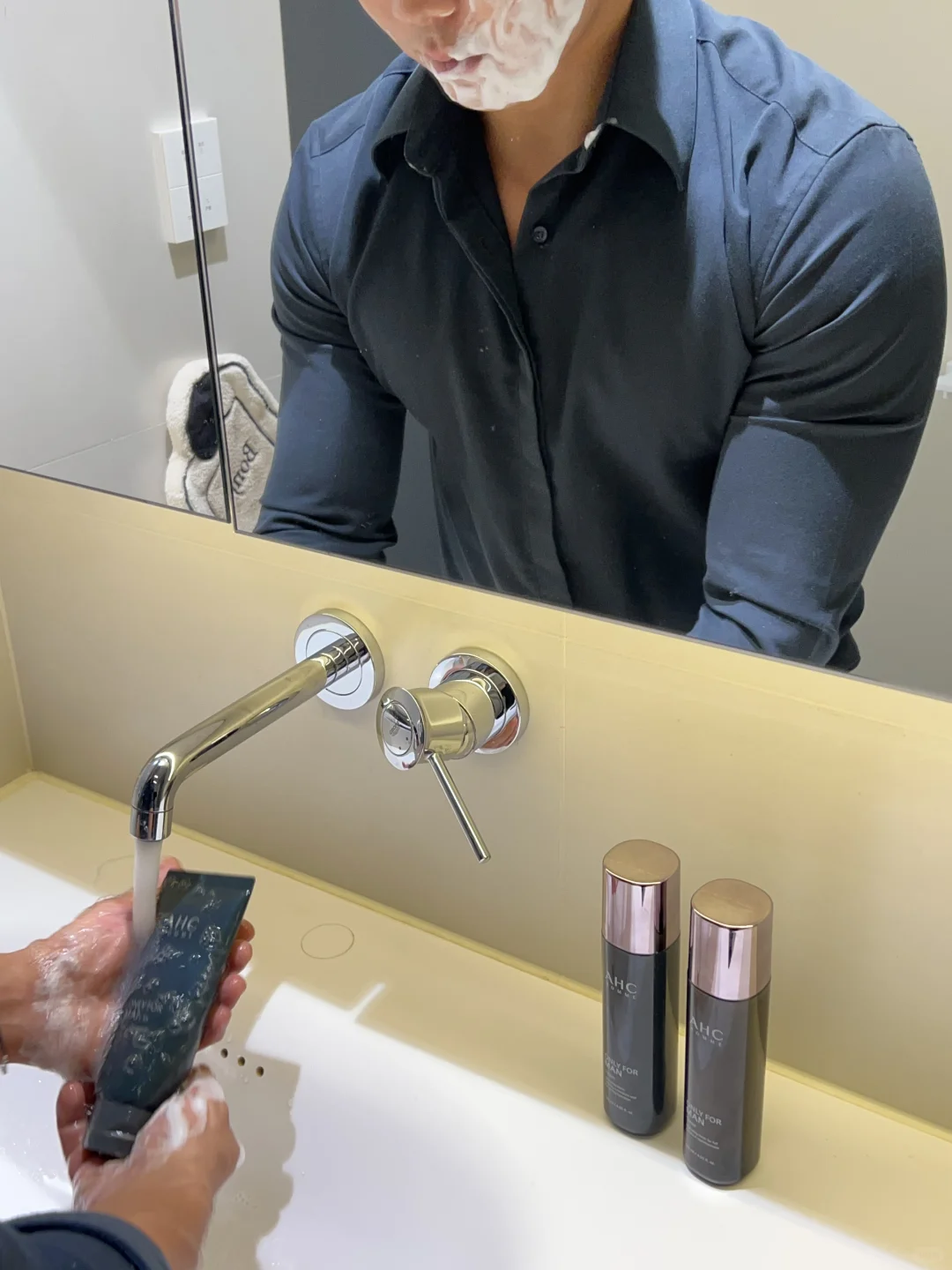 首先清洁,油敏肌在清洁上千万不能用力过猛。要选用温和清洁的洗面奶。这款AHC男士平衡舒缓洁面乳,肤感就很好,洗完脸不紧绷,清洁力也很在线,细腻的泡沫能快速溶解油脂黑头,把熬夜产生过剩油脂和污垢清洁出来。